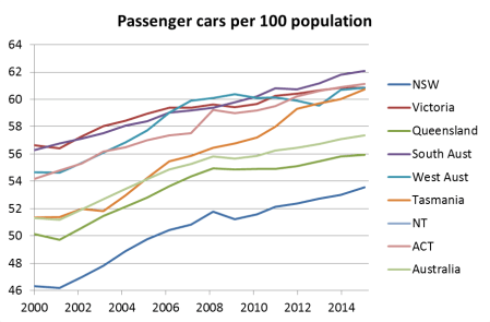 What is interesting in this chart is the relative rate of car ownership between states and territories. The Northern Territory is consistently the lowest – I’m guessing related to remote indigenous populations with low car ownership. New South Wales may reflect the relatively dense Sydney where car ownership is less important for many. I’m not sure of the reasons for other differences. It might be slight differences in reporting from the state agencies (see ABS’s explanatory notes).