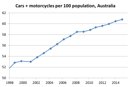 Firstly, by car ownership rate I mean the ratio of the number of registered “passenger vehicles” (from the ABS Motor Vehicle Census) to population (also from ABS). So while some of the measures in the post are not strictly for cars only, I’ve not worried too much about the distinction because I’m most interested in the trends.