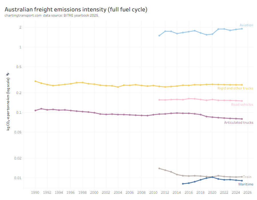 Next is a new chart showing freight emissions intensity. You may have known that trains and ships are very efficient at moving freight – but did you know they emit around 8 times less emissions than articulated trucks (per tonne-km), and around 190 times less emissions than than aeroplanes?