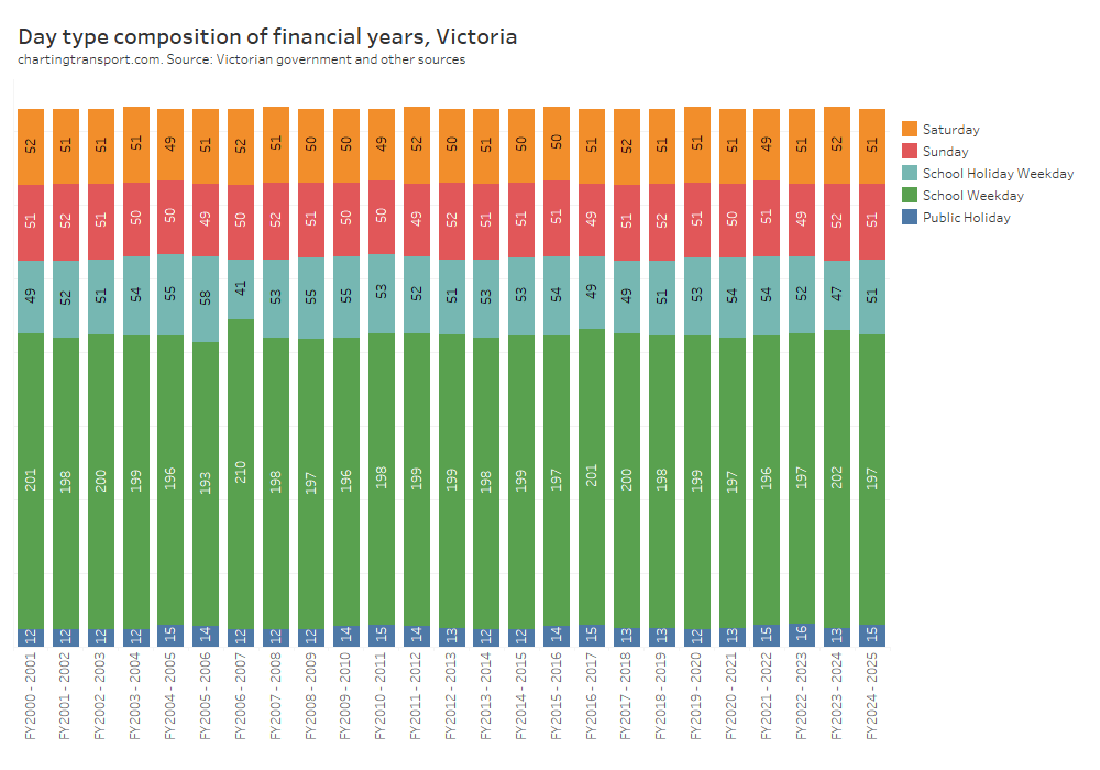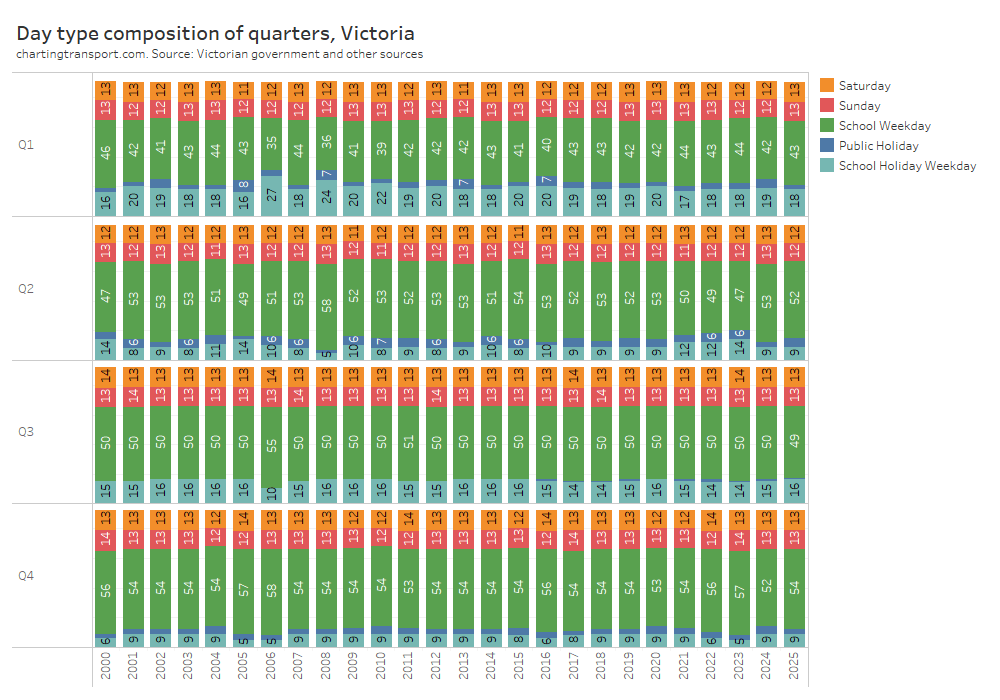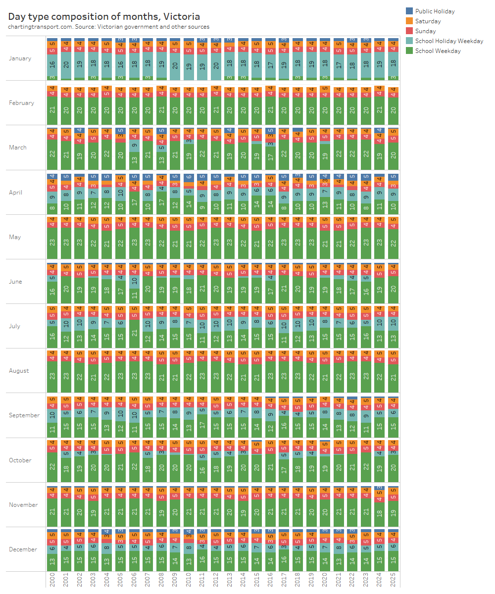 Technical note: I have assumed Melbourne public holidays have the same day type weighting as Sundays, for want of more published data.