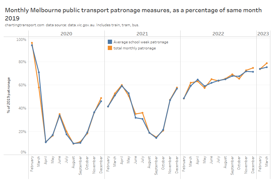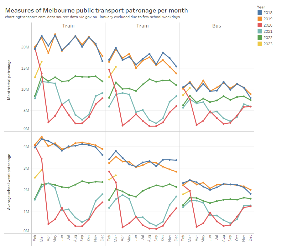 The closest estimate to the compiled average school week data is using Melbourne 2022 day type weightings to adjust monthly totals (the difference is up to 0.9% in April 2023). This suggests Melbourne is probably the best city from which to source day type weightings to apply to Sydney (both large cities), and 2022 (a post-pandemic year) might be a better source year for these weightings. That’s consistent with Sydney having similar ratios of weekday to weekend patronage as Melbourne.