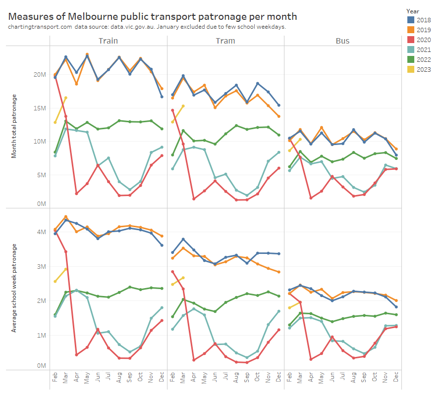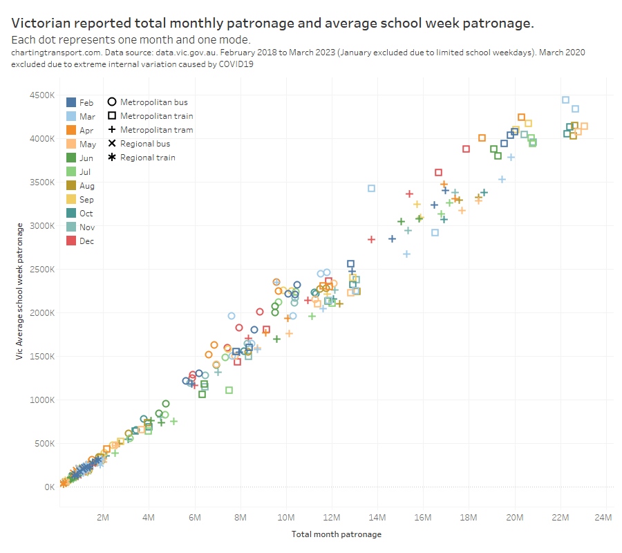 Transport for NSW have an interactive dashboard from which you can manually transcribe (but not copy or download) the average school weekday patronage and average weekend daily patronage for each mode and each month. I’ve compiled a typical school week estimate using 5 times the average school weekday plus 2 times the average weekend day. This is likely pretty close to what true average school week patronage is (more discussion below).