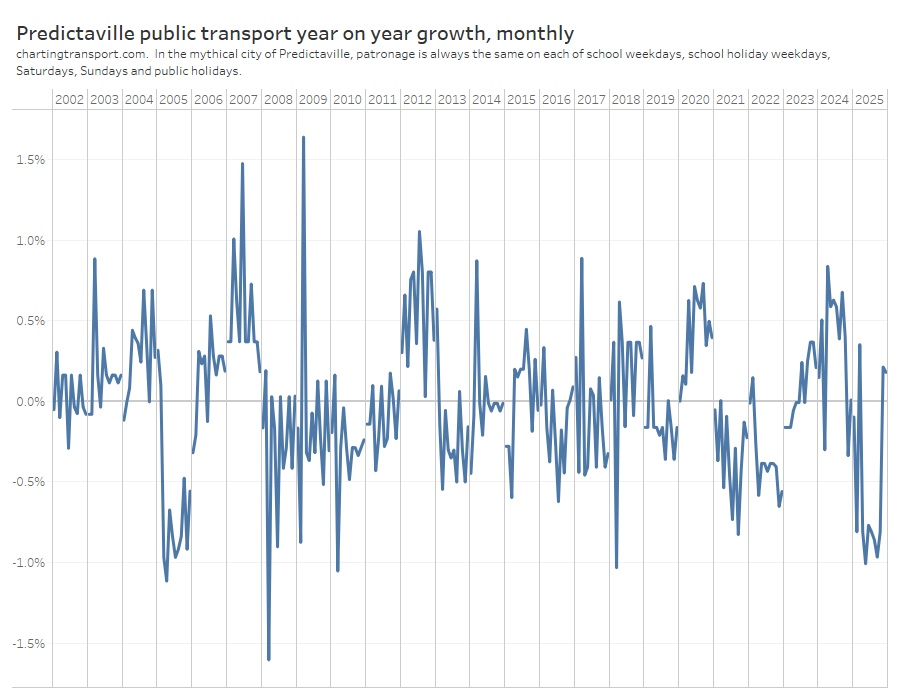 Calculated growth ranges between +0.8% and -0.9%, which is about half as bad as +1.6% to -1.6% when measured at other month ends, but still not ideal (the true value is zero). The errors in the real world will depend on the relative mix of patronage between day types (Predictaville patronage per day type was modelled on Melbourne’s buses).