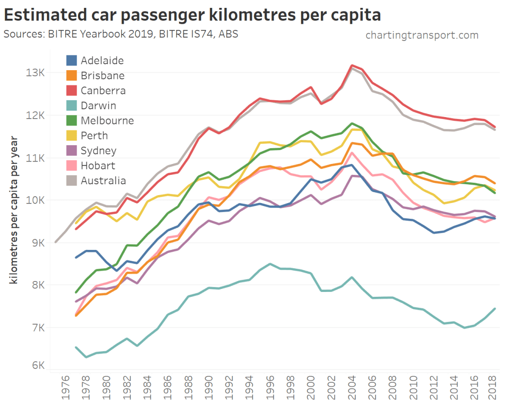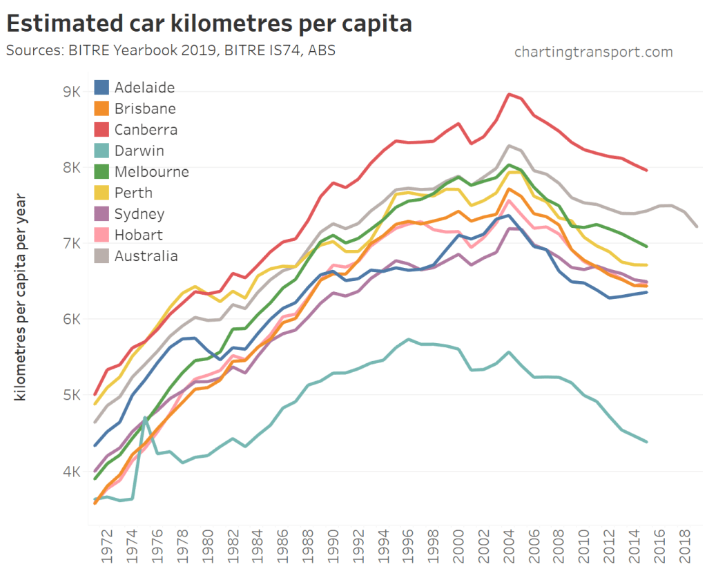 Canberra has dramatically reduced vehicle kilometres per capita since around 2014 leaving Brisbane as the top city.