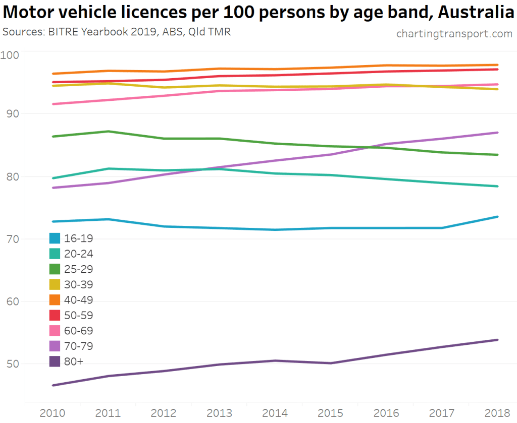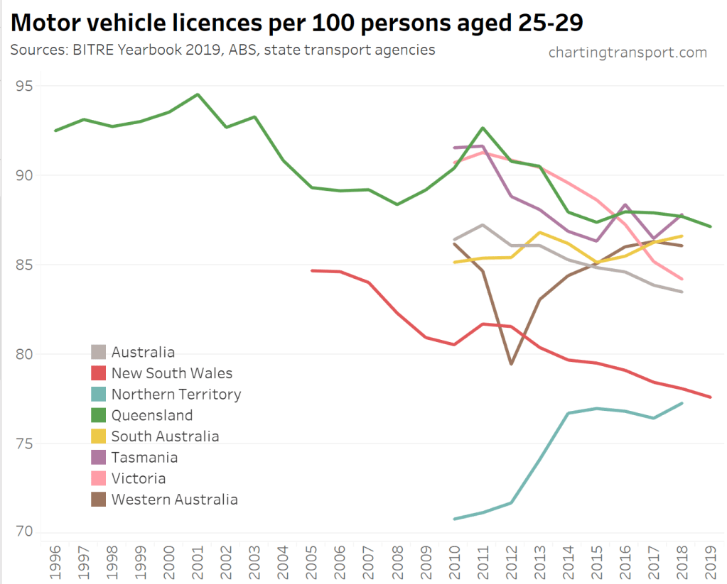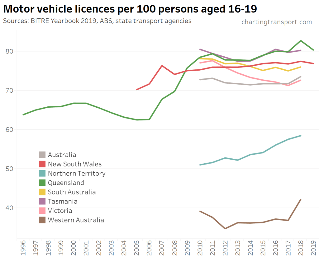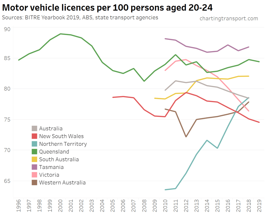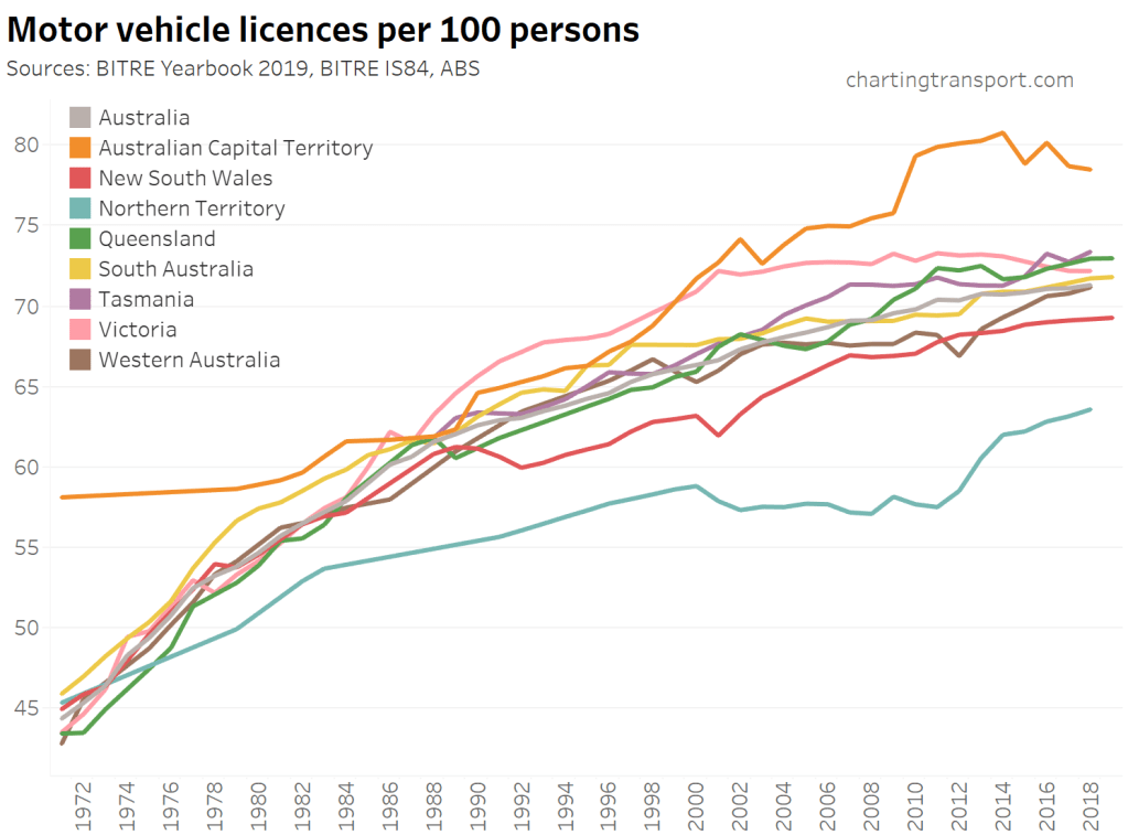 Here is motor vehicle licence ownership for people aged 15+ back to 1971 (I’d use 16+ but age by single-year data is only available at a state level back to 1982). Note this includes any form of driver’s licence including learner’s permits.