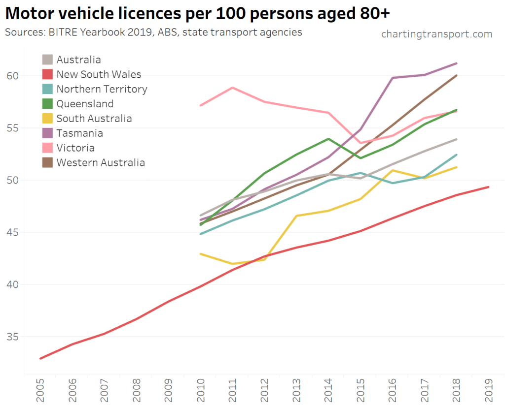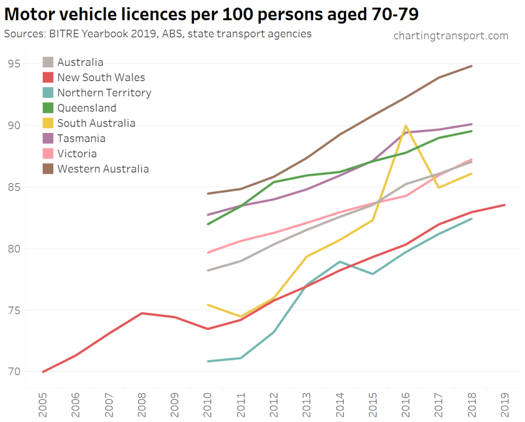 Many age bands exceed 100 (more licence holders than population) and there are some odd kinks in the data around 2015-2017 for all age bands (especially 70-79). I’m not sure that it is plausible that licencing rates of teenagers might have plummeted quite so fast in recent years. I’m inclined to treat all of this ACT data as suspect, and I will therefore exclude the ACT from further charts with state/territory disaggregation.