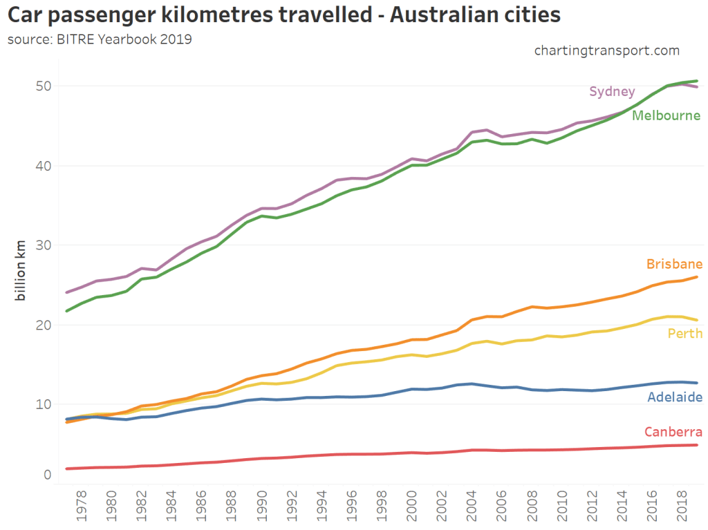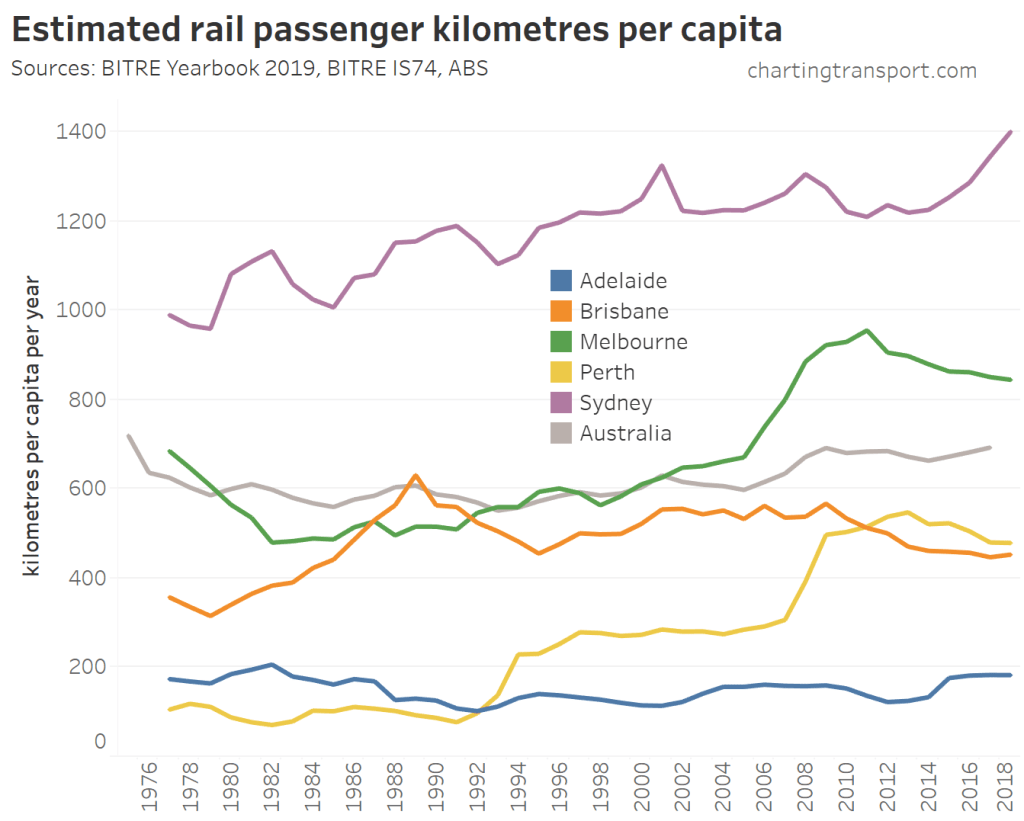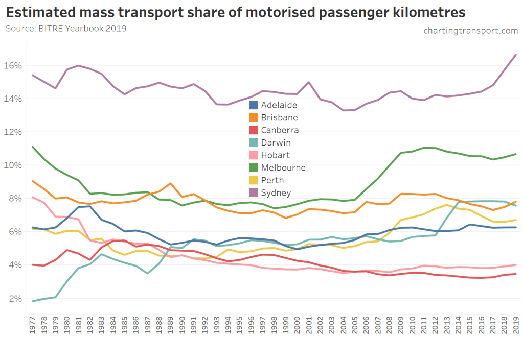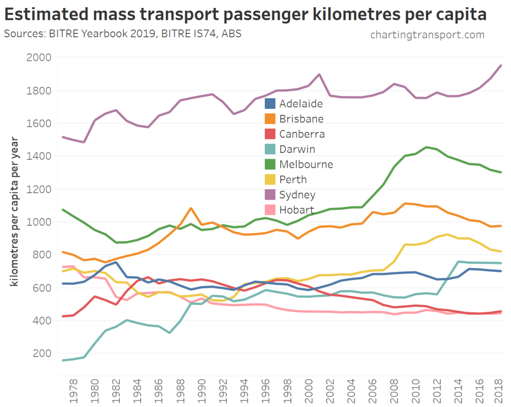 This chart produces some unexpected outliers. Hobart shows up with very high public transport trips per capita in the 1970s, which might be relate to the Tasman Bridge Disaster which severed the bridge between 1975 and 1977 and resulted in significant ferry traffic for a few years (over 7 millions trips in 1976-77). Canberra also shows up with remarkably high trips per capita in the 1980s for a relatively small, low density, car-friendly city, but has been in steady decline since.