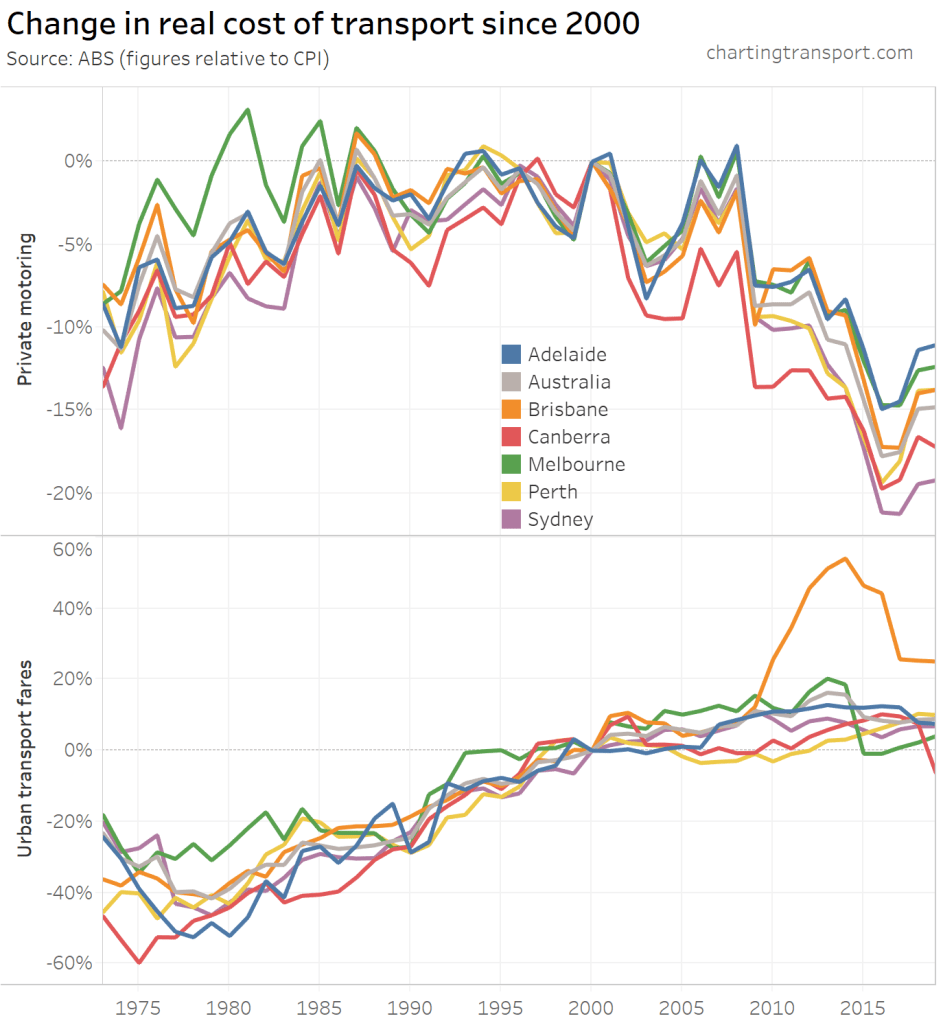 What’s most relevant is the relative change between years – e.g. you can see Brisbane’s experiment with high urban transport fare growth between 2009 and 2017 in both charts.