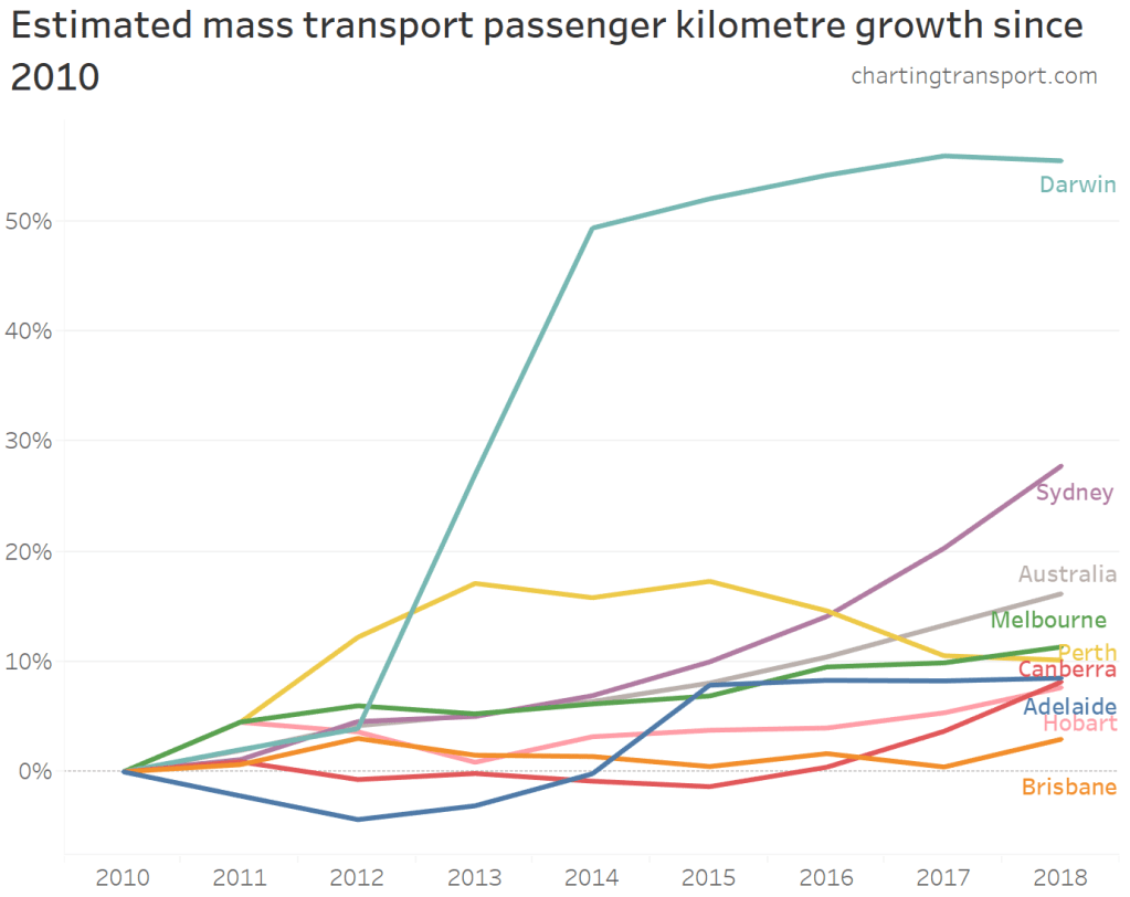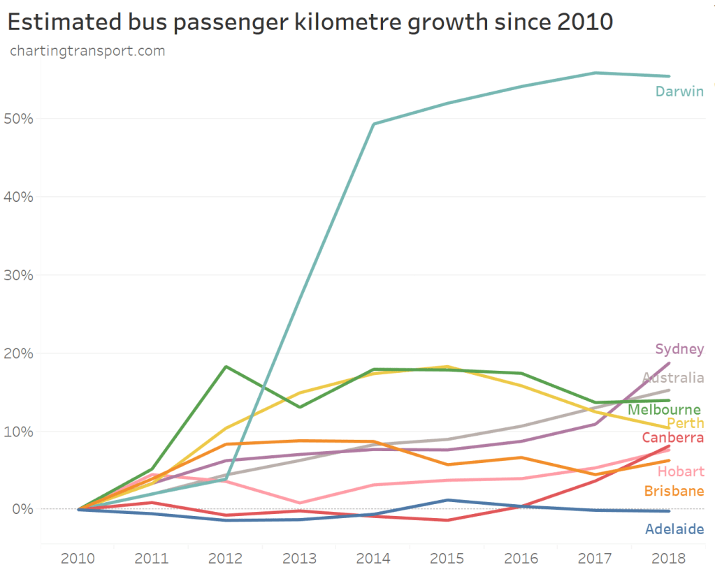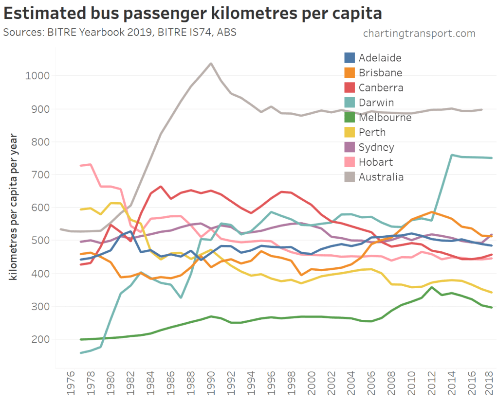 Darwin had elevated bus passenger kilometres from 2014 to 2019 due to bus services to a resources project (BITRE might not have counted these trips as urban public transport).