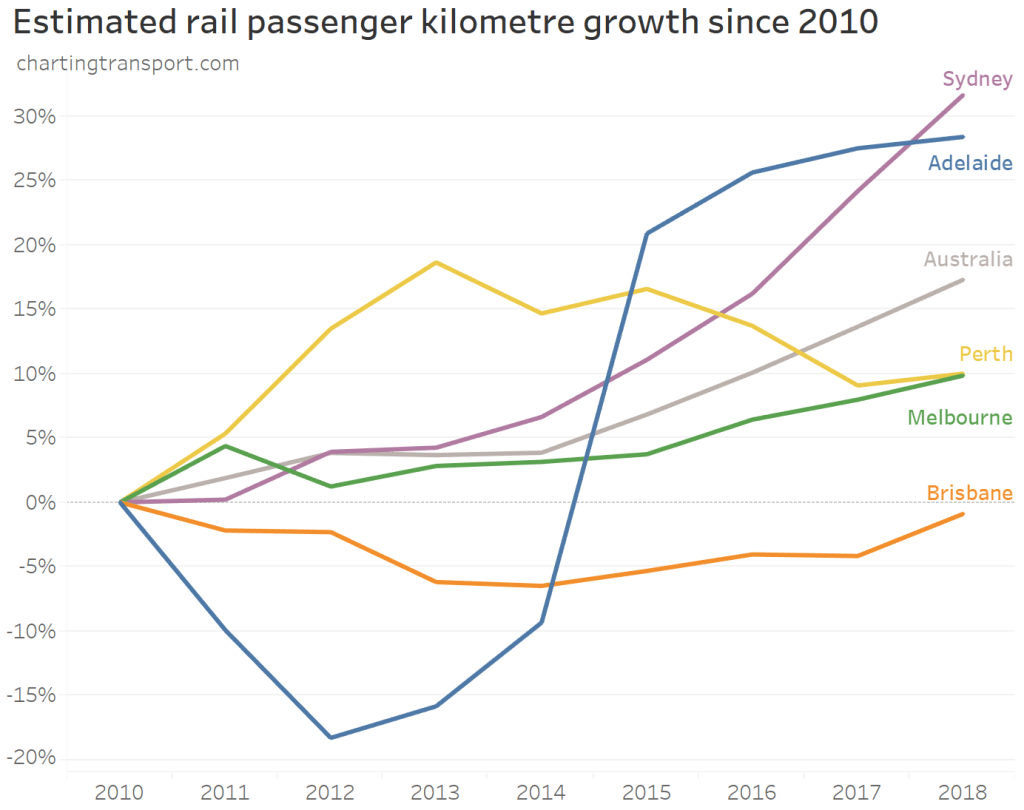 Note there are some variances between the ranking of the cities – particularly Perth and Brisbane (BITRE have average train trip length in Brisbane at around 20.3 km while Perth is 16.3 km).