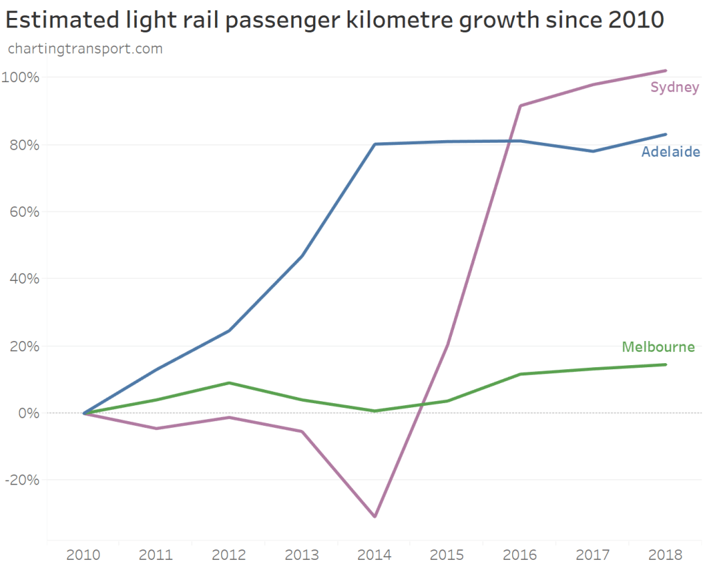 Canberra, Sydney, and Brisbane were seeing rising patronage per capita up to June 2019, just before the pandemic hit.