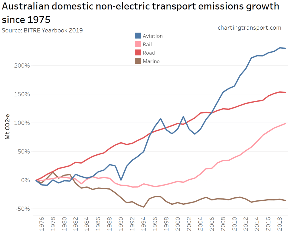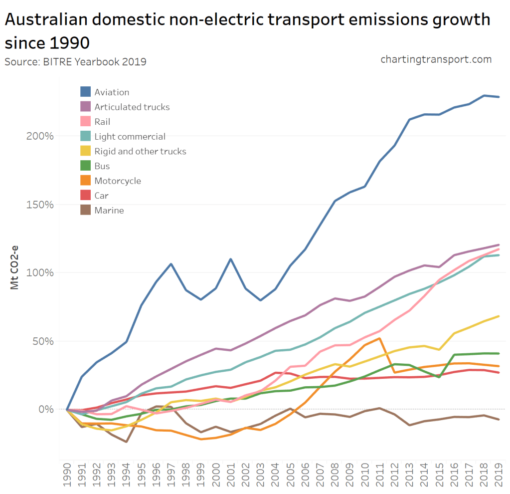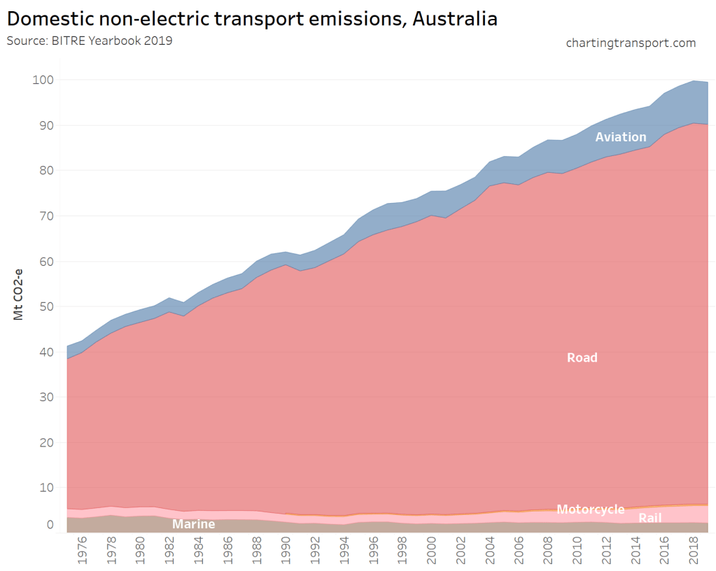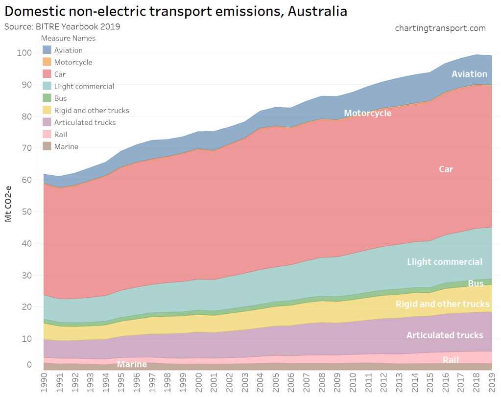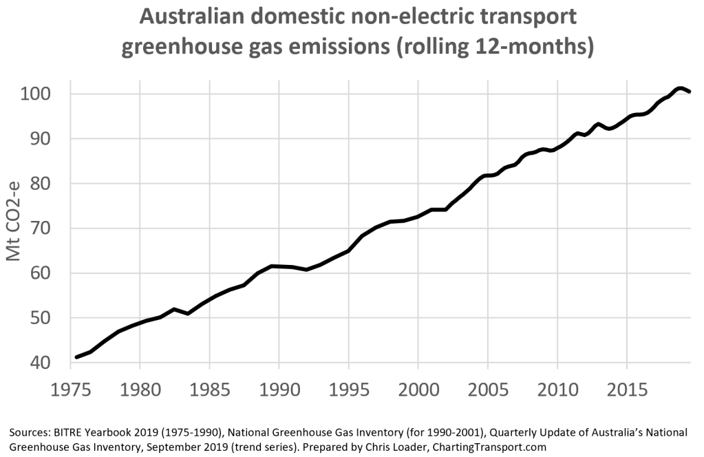 Transport now makes up 19% of Australia’s greenhouse gas emissions (excluding land use), up from 15% in 2001: