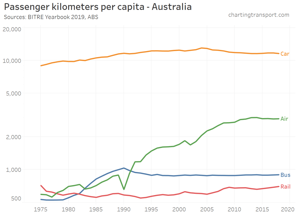 The Australian Bureau of Infrastructure and Transport Research Economics (BITRE) have recently published their annual yearbook full of numbers, and this post aims to turn those (plus several other data sources) into information and insights about the latest trends in Australian transport.