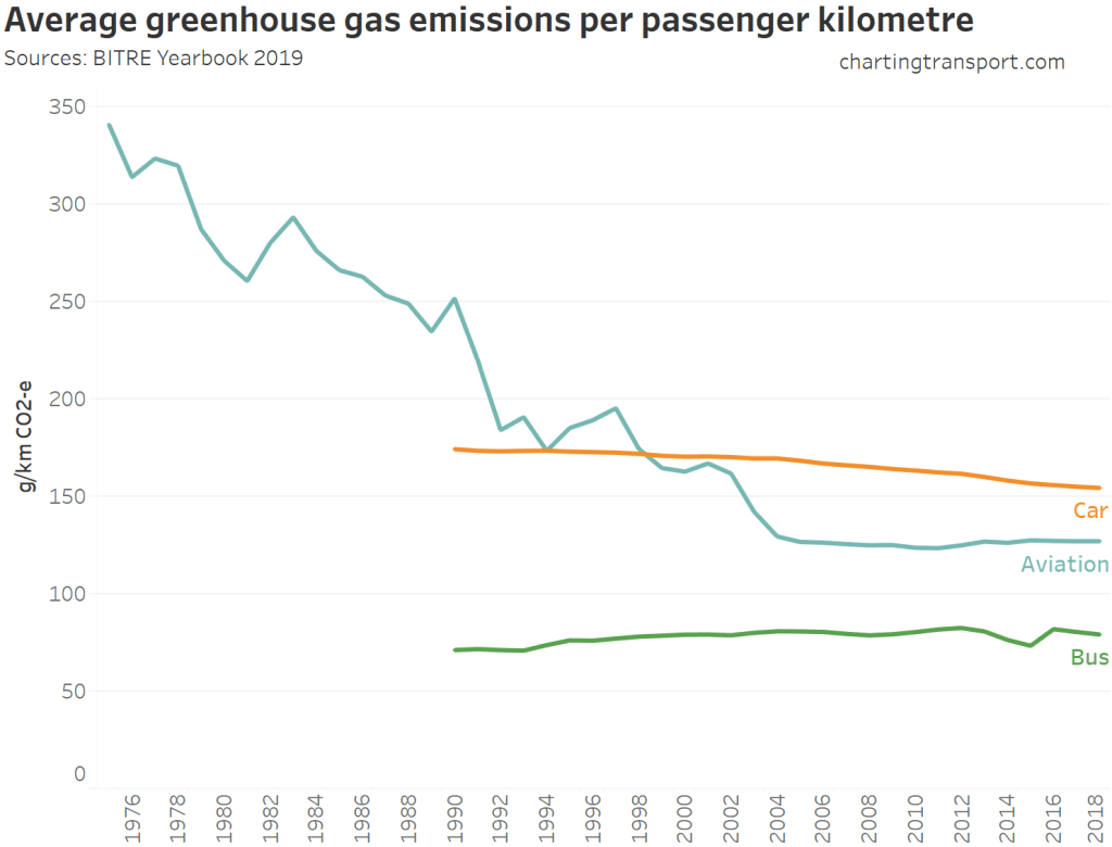 Car emissions have continued a slow decline, but bus and aviation emissions per passenger km increased in 2021, presumably as the pandemic reduced average occupancy of these modes.