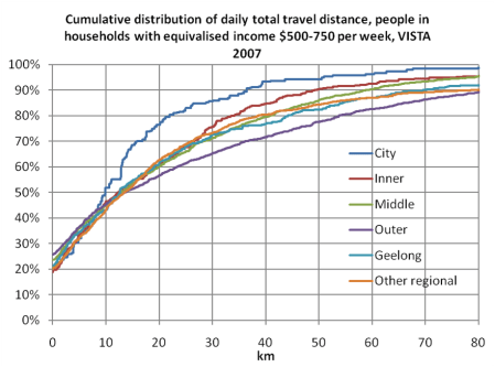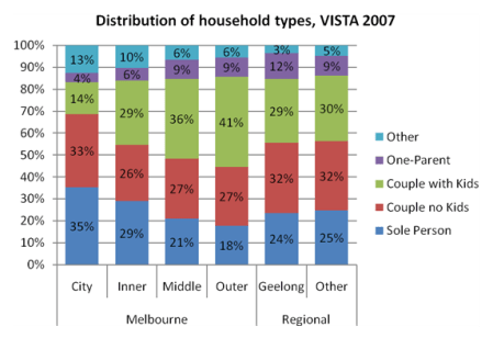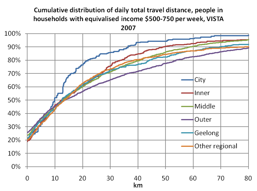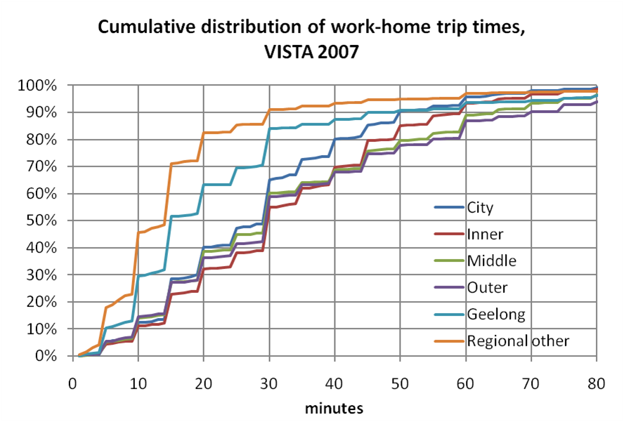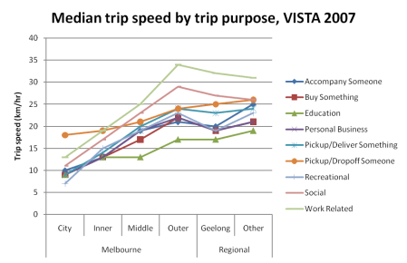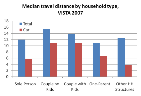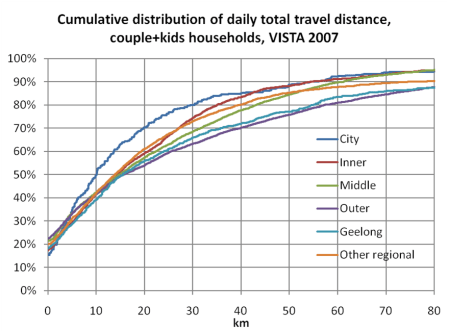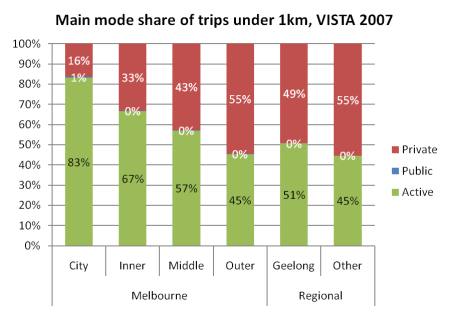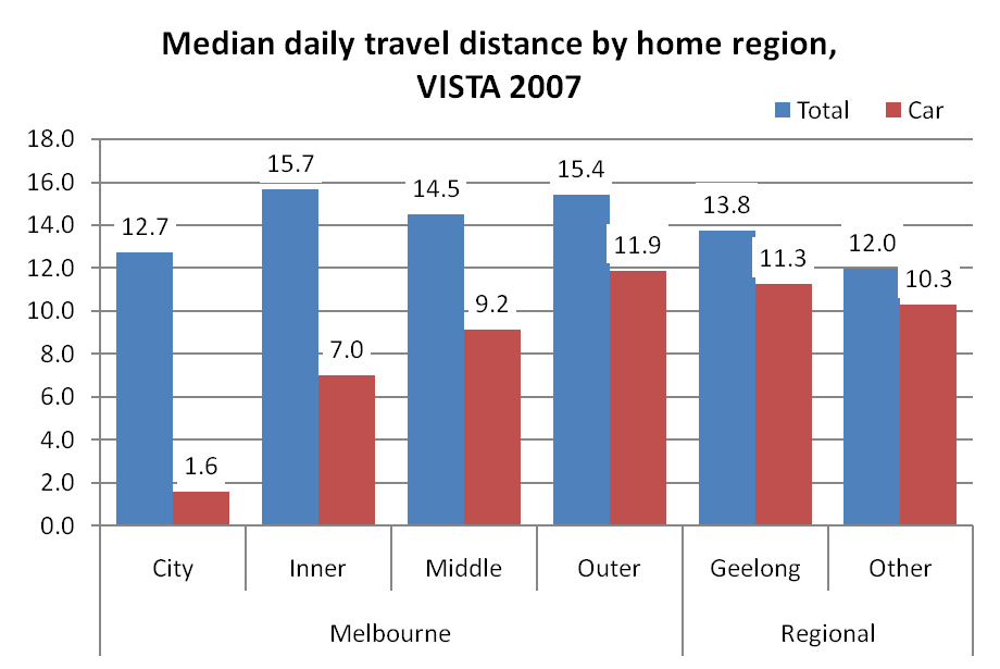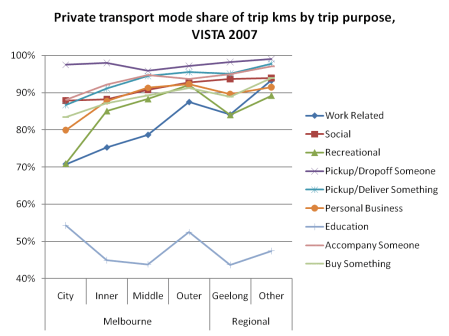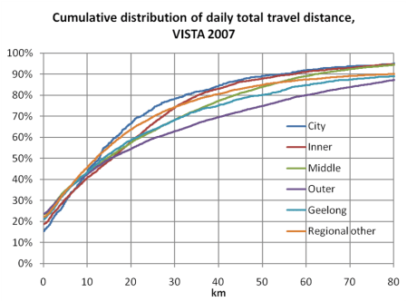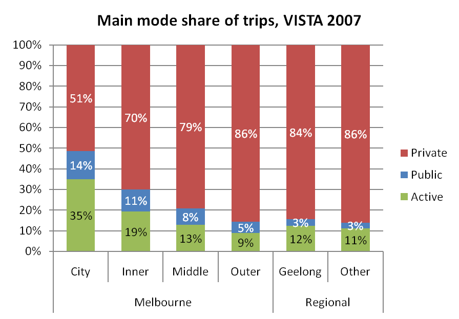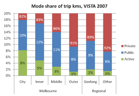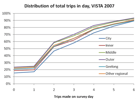 Most of the analysis in this post comes from the Victorian Integrated Survey of Transport and Activity (VISTA), using the 2007-08 and 2009-10 datasets combined. The survey covers Melbourne Statistical Division (MSD), Geelong, Bendigo, Ballarat, Shepparton and the Latrobe Valley (that is, the capital and major regional cities in Victoria, Australia). The combined dataset includes some 85,824 people in 33,526 households who recorded their travel for one calendar day each.