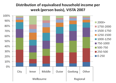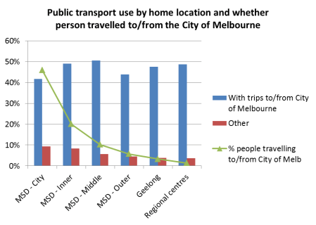 When I measure public transport use, I am measuring whether a person used any public transport on their nominated travel survey day (the survey covered every day of the year). See here for a map showing the geographic breakdown of Melbourne into city, inner, middle and outer.
