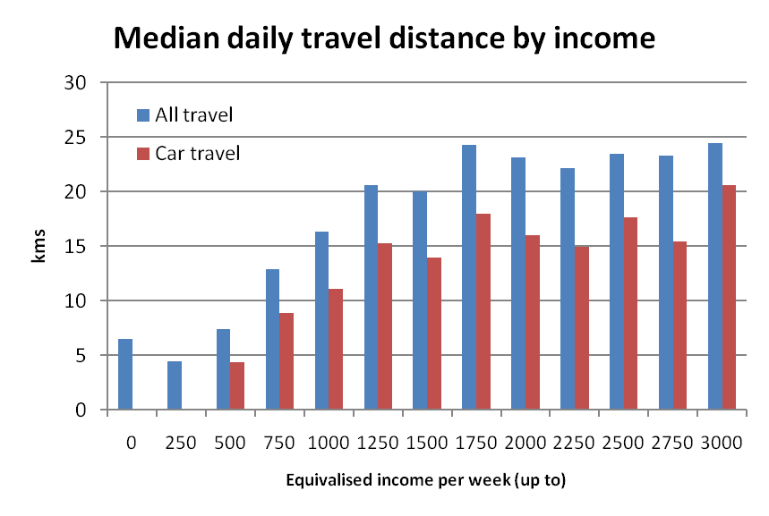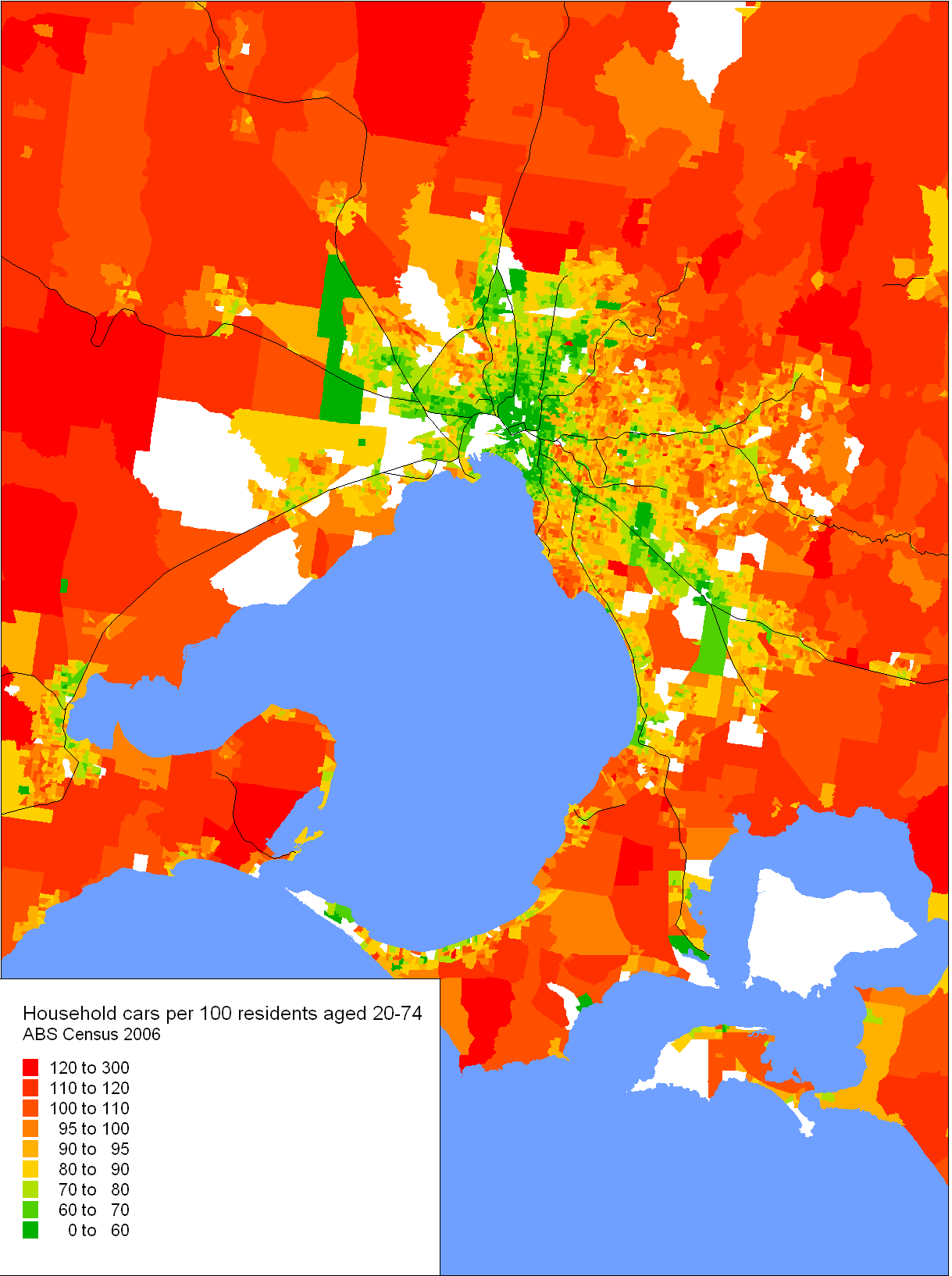 The census figures show a slightly different distribution but should be more accurate (being a census not a survey). Suburban areas with lower car ownership were generally those that are less well-off (and the large green areas on the western fringe of Melbourne are actually mostly prisoners, who tend not to own cars).