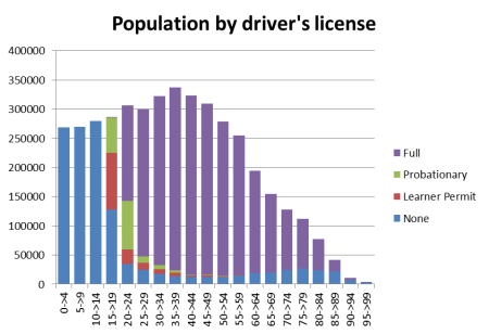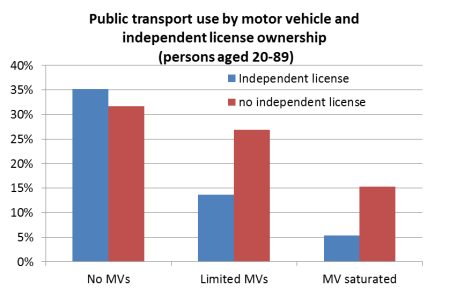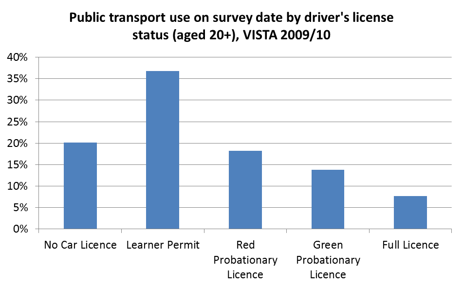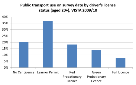 In fact, 55% of people who used public transport on their survey date had a full or probationary driver’s license. As driver’s license ownership is more saturated than motor vehicle ownership, it appears to be a weaker driver of public transport use.