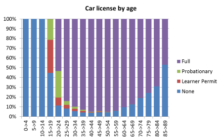 What you might not have expected is for people with a learner permit to be the most likely to have used public transport, even more than people with no licence at all. They are mostly younger people and you will see their rates of public transport in part two of this series.