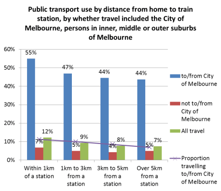 Overall people living closer to train stations were slightly more likely to travel to/from the City of Melbourne, and if they did, they were a little more likely to use public transport.