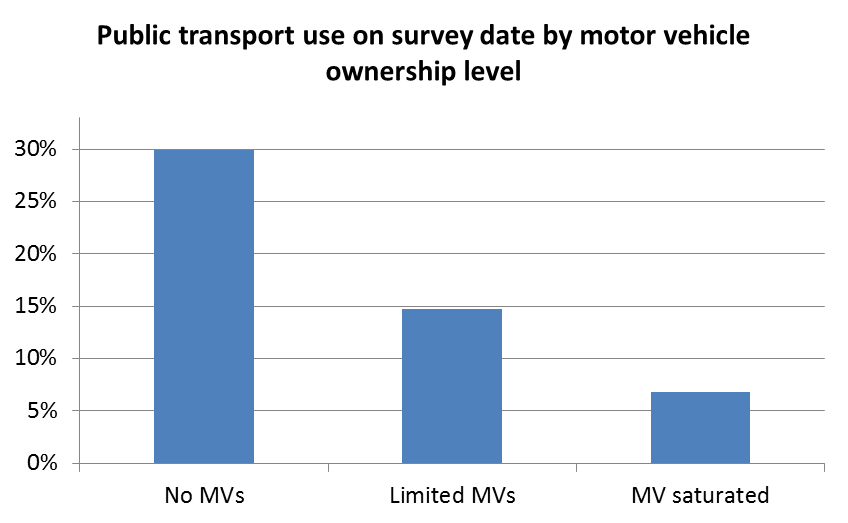 - Public transport use was lower for people from households with saturated motor vehicle ownership (compared to those with limited motor vehicle ownership).