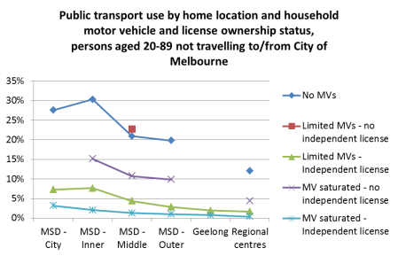 - For people not travelling to/from the City of Melbourne, public transport use seems largely related to distance from the city centre (a rough proxy for PT supply) and the level of motor vehicle ownership, with the exception of those in the inner city where non-motorised transport modes are likely to be more significant.