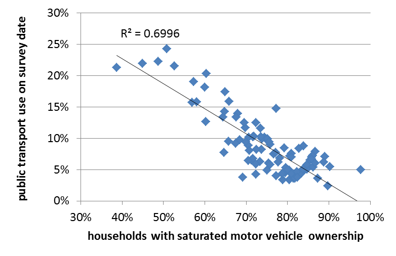 It will come as no surprise that there was a pretty strong relationship between motor vehicle ownership and public transport use: