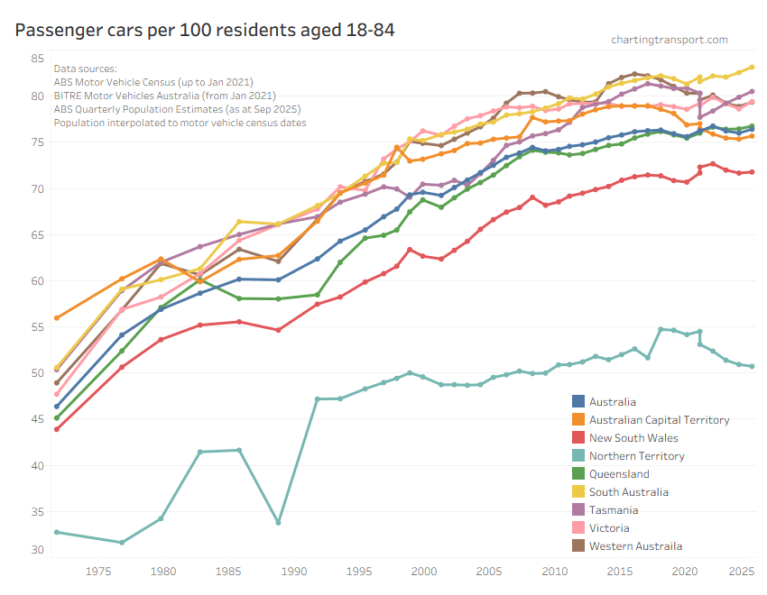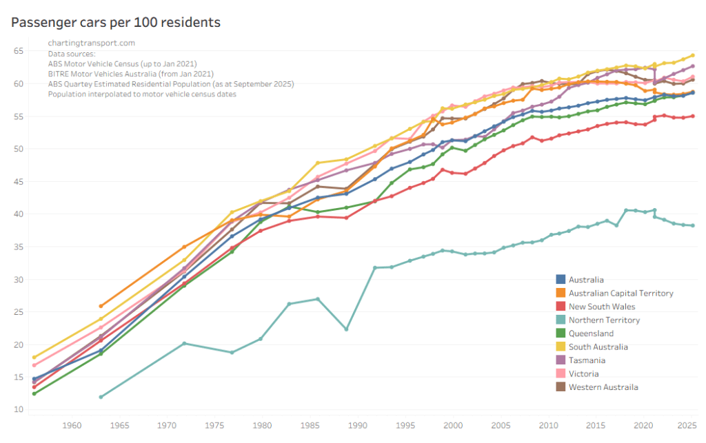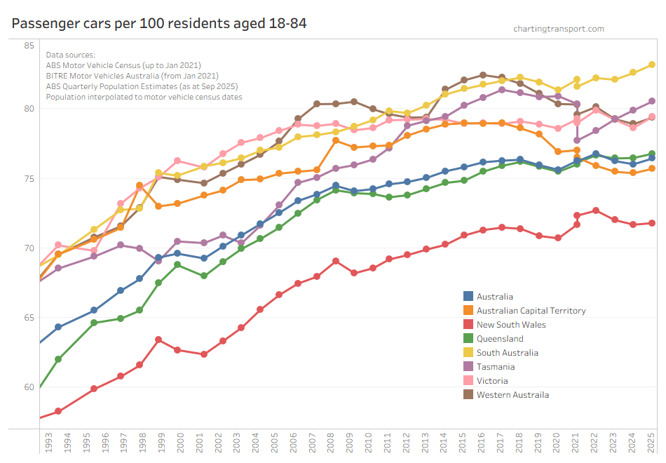 Several states appear to have had peaks in car ownership – Tasmania in 2017, Western Australia in 2016, and ACT in 2017.