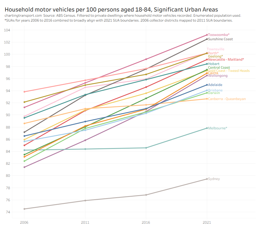 This analysis is slightly different to previous analysis of census data on this blog. In that analysis I used 2011 SUA boundaries for all census years, while analysis on this page allows for changes in SUA boundaries into 2016 and 2021. The previous analysis will have sometimes calculated lower rates of motor vehicles per capita as newer urban fringe areas would have been outside the 2011 boundaries.
