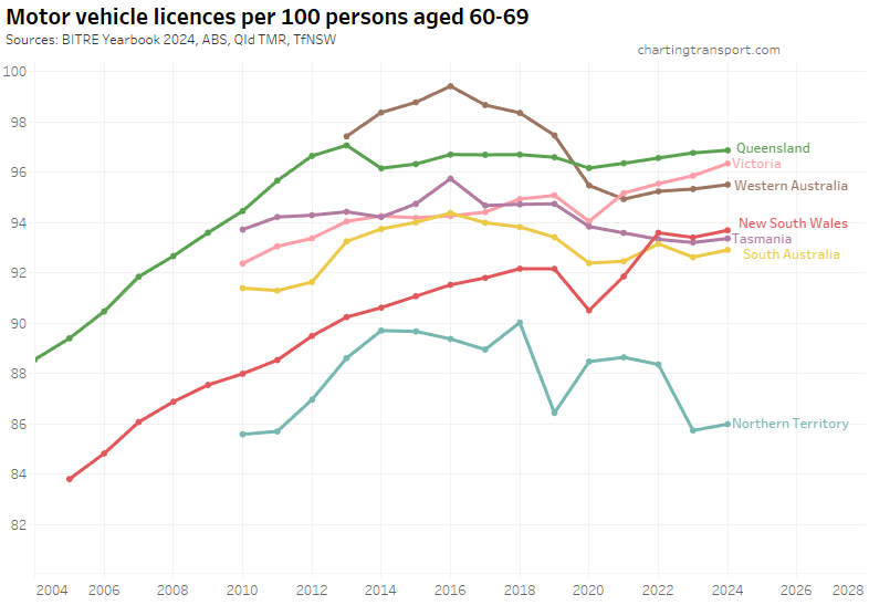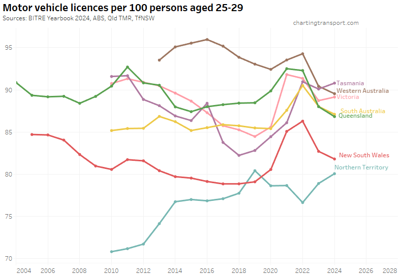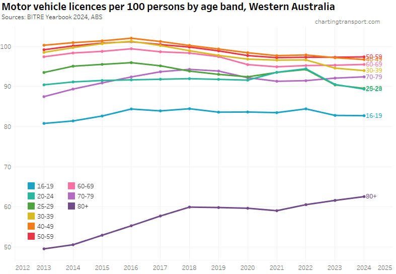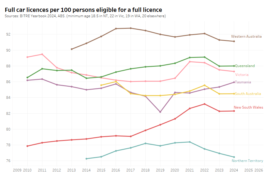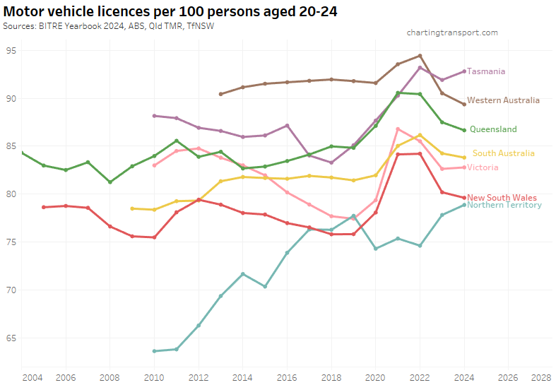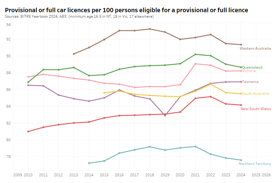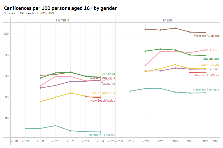 For 20-24 year olds the pandemic caused big increases in the rate of licence ownership in most states, however Victoria, South Australia, and Western Australian appear to have peaked. Several states saw a decline between 2023 and 2024.