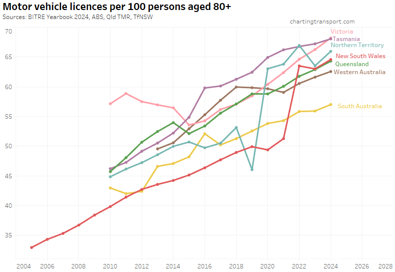 Final remarks: It’s easily to complain about poor data quality, but I do empathise with the people responsible for compiling these statistics. No doubt they are dealing with legacy systems and databases that might be hard to query and may or may not have good documentation. Then there’s plenty of room for confusion and double-counting across car, motorcycle, and heavy vehicle licences. And there are so many different types of licences – full, provisional, learners, probationary, restricted, suspended, interim, ordinary, extra-ordinary, etc. I suspect BITRE had many challenges trying to compile consistent data from all jurisdictions. Hopefully with more effort across the jurisdictions the quality could be improved in future. Licence ownership is unsurprisingly a significant driver of travel behaviour, so it is important to report licence holder numbers as accurately as possible.