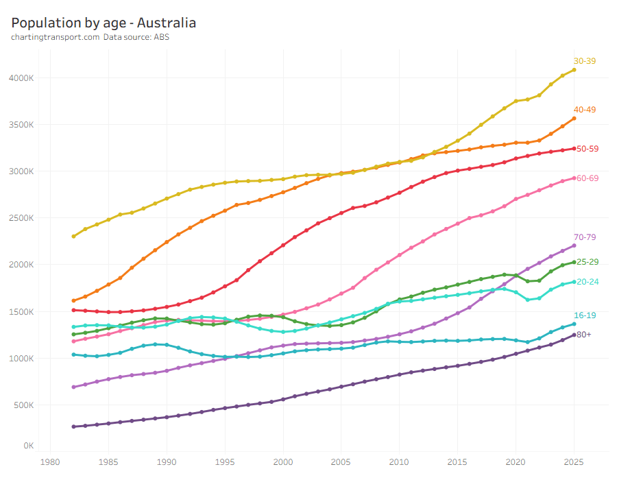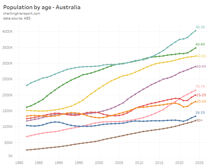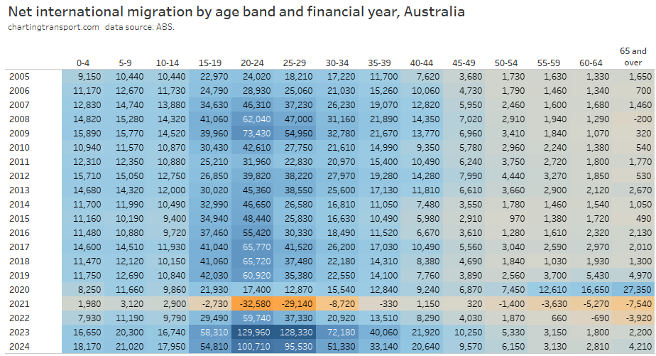 Here’s another view of this issue – Australia population by age band, showing clear dips in 16-29 year-olds during the pandemic: