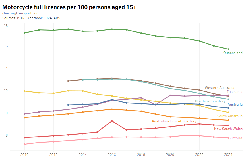 Motorcycle licence ownership per capita has been declining in most states and territories, except Tasmania.