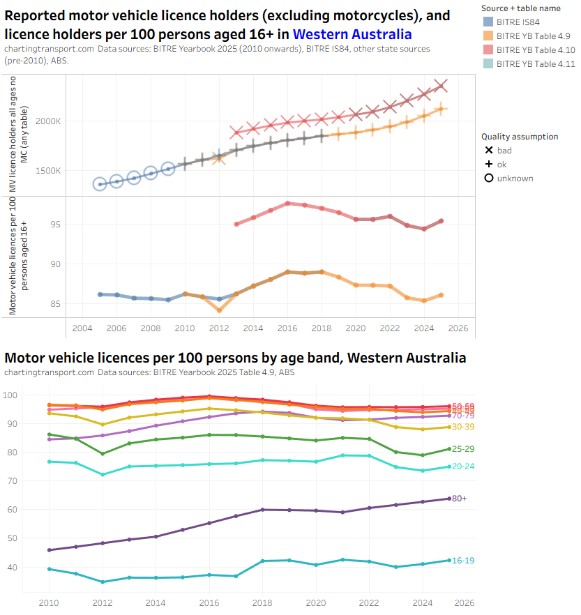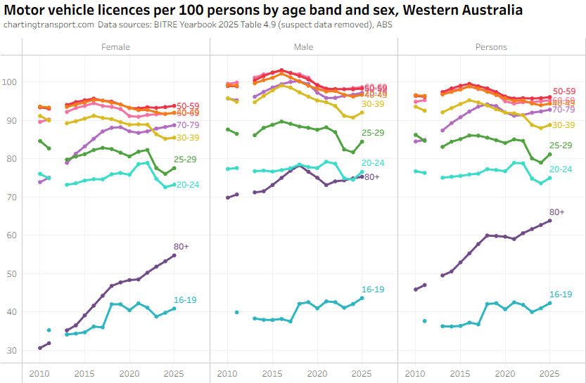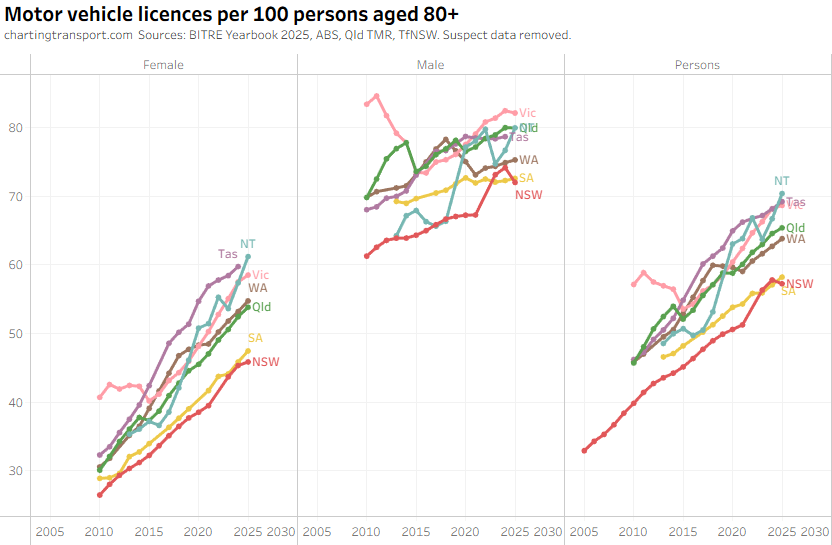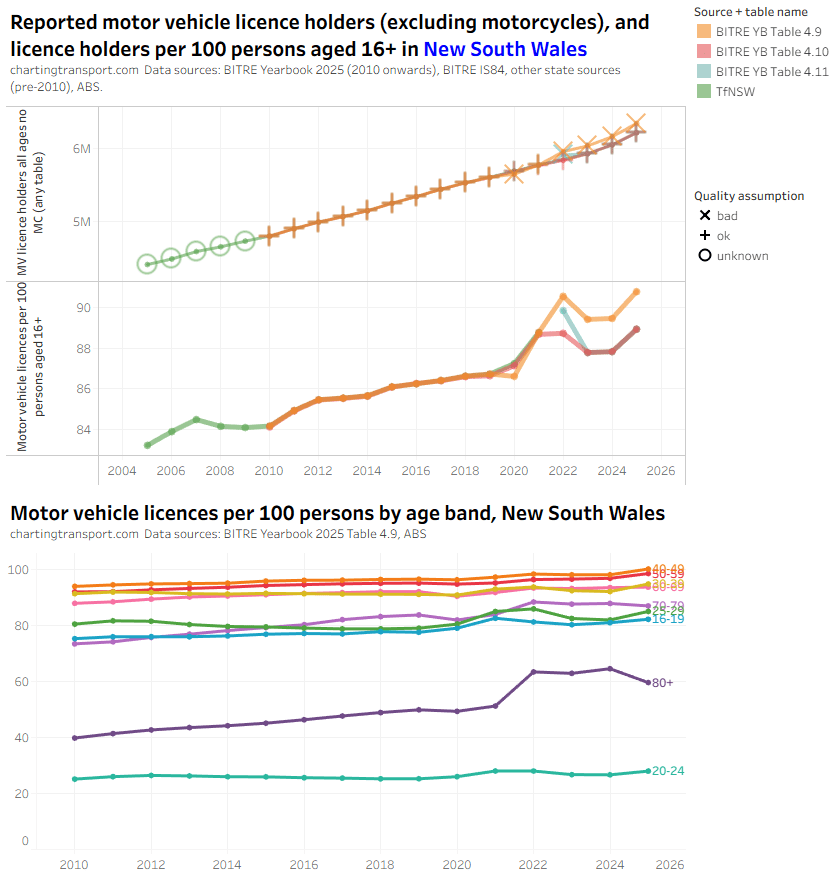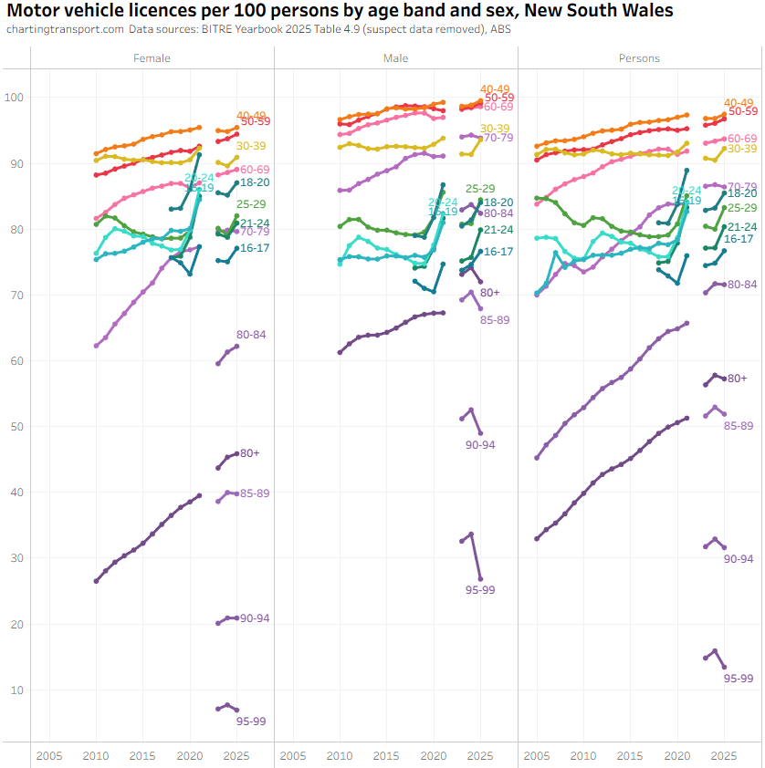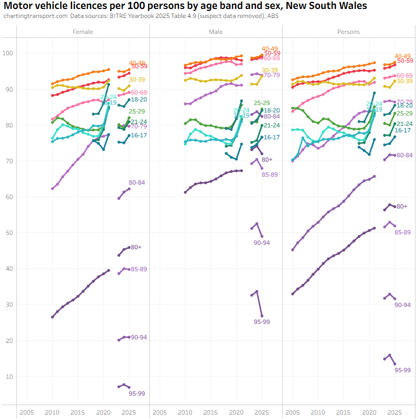 There was an unexpected increase in motor vehicle licences per capita for those aged 80+ from 2022 to 2024 in the BITRE data, which seems suspect. There were also sharp increases in 2025 in younger aged bands, but this might be plausible. The TfNSW data also shows a jump in licences per capita for 80+ but not by a much smaller amount.