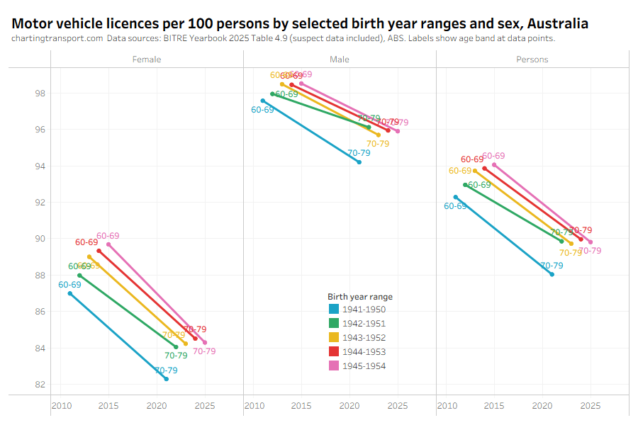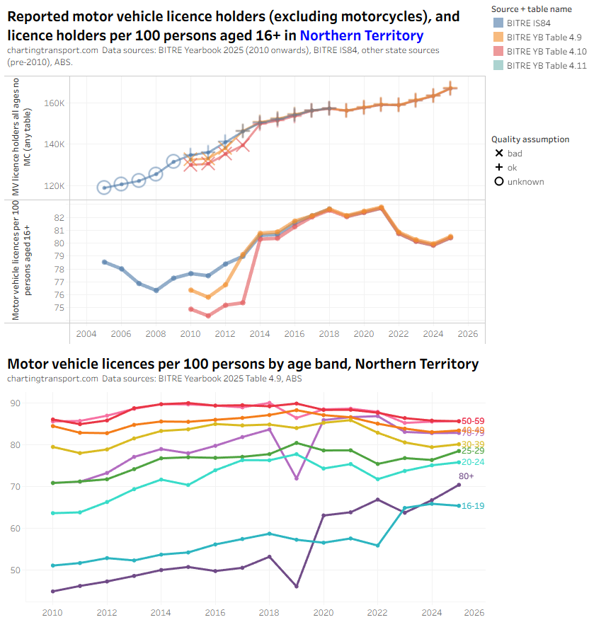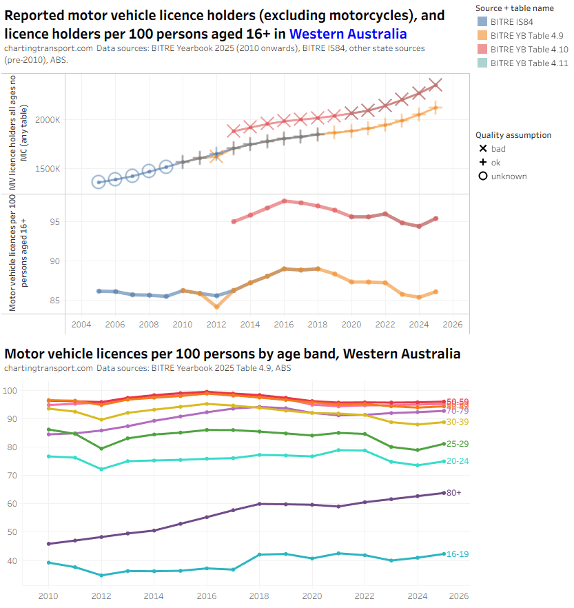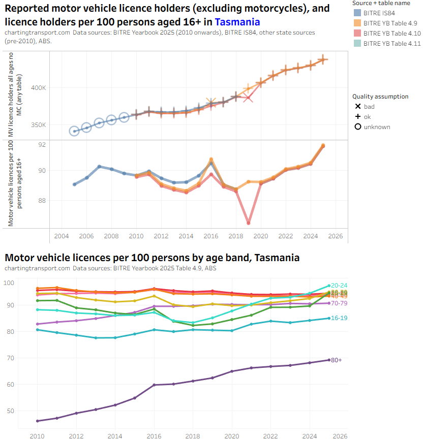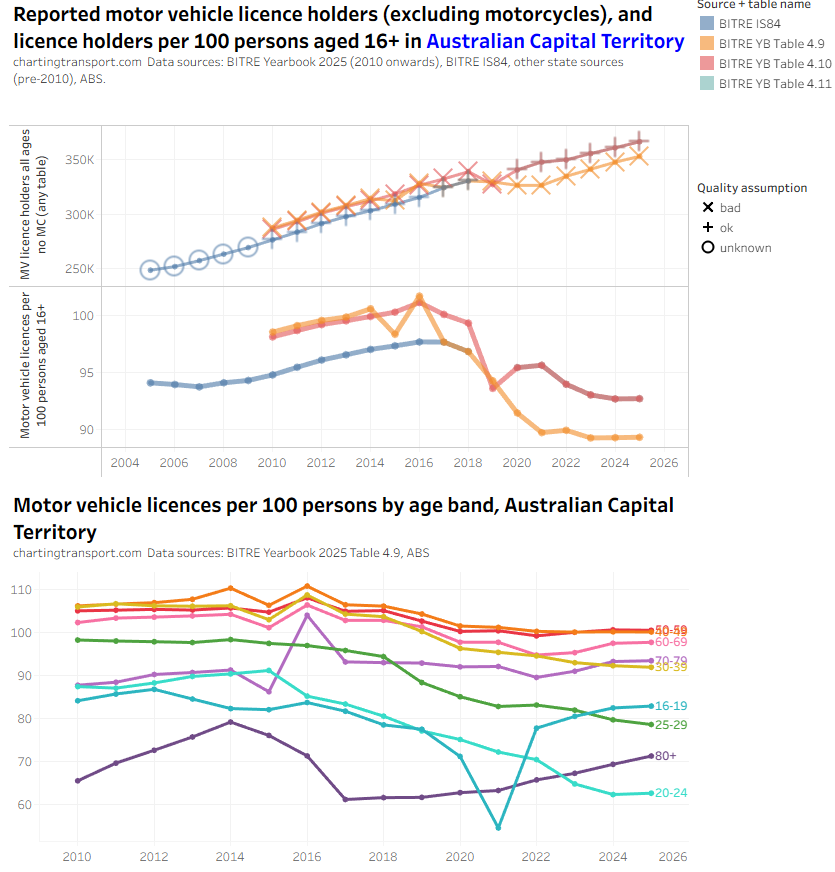 There was an unexpected increase in motor vehicle licences per capita for those aged 80+ from 2022 to 2024 in the BITRE data, which seems suspect. There were also sharp increases in 2025 in younger aged bands, but this might be plausible. The TfNSW data also shows a jump in licences per capita for 80+ but not by a much smaller amount.