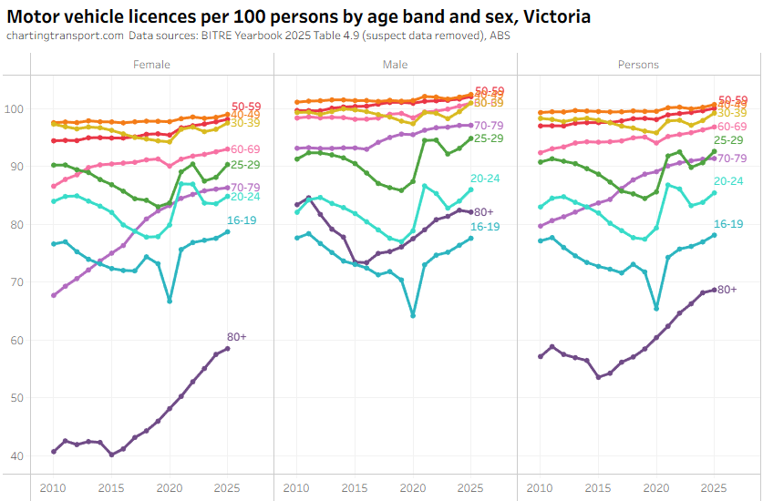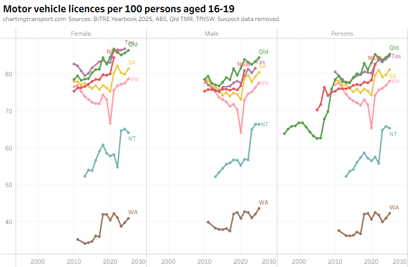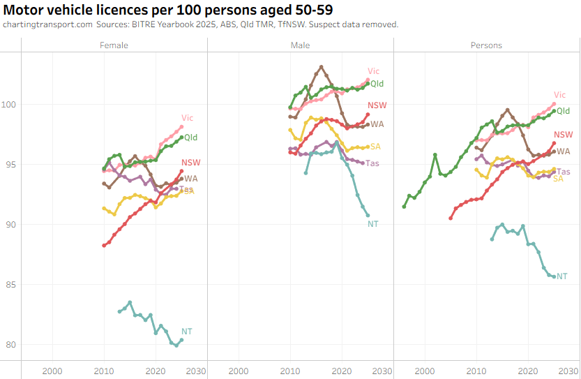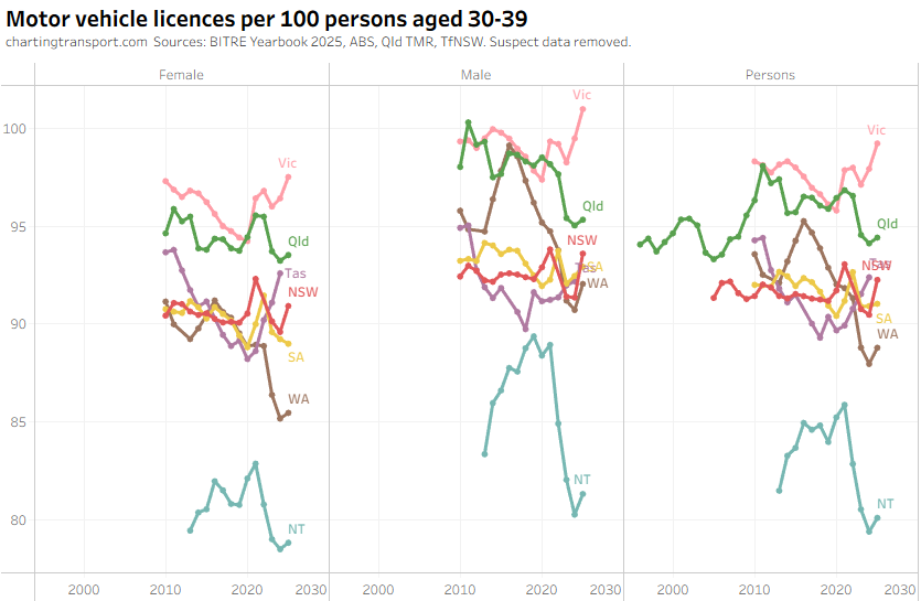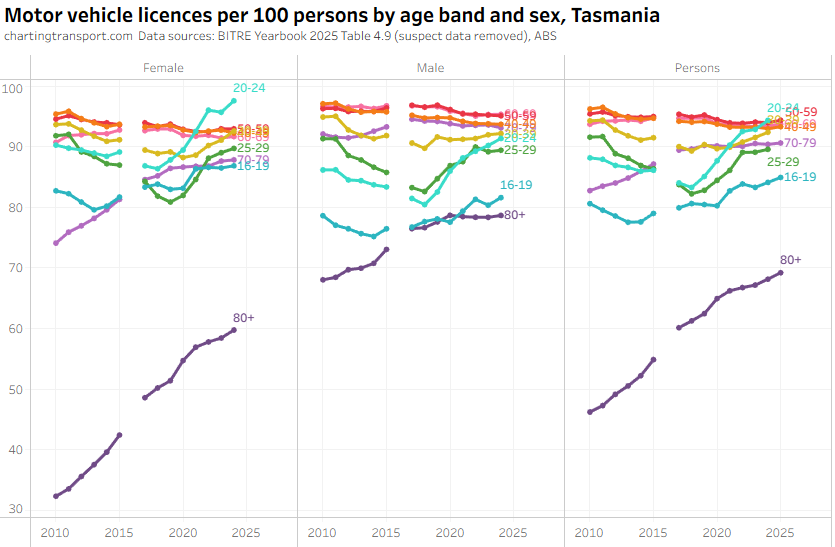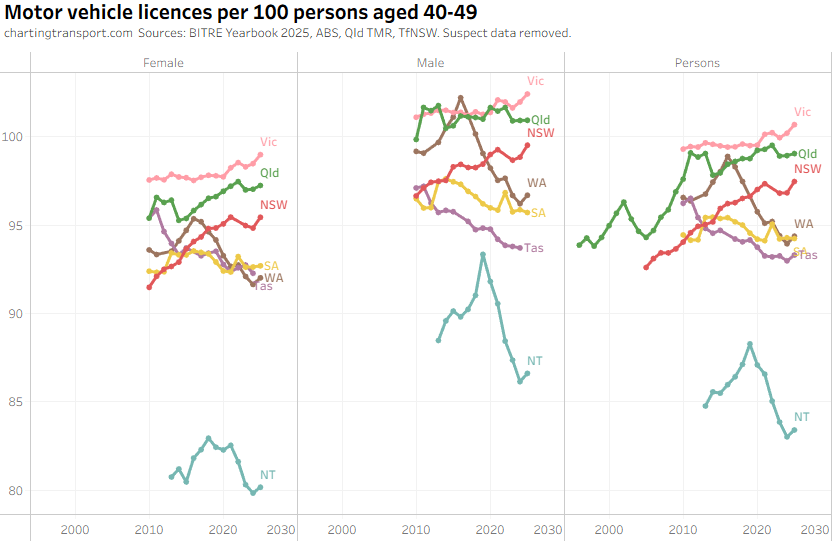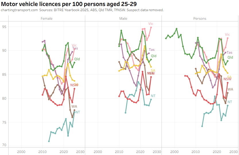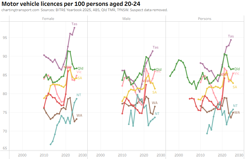 The ever increasing licencing rate for 20-24 females looks a bit suspect, and I’ve filtered out a lot of suspect 2025 data.