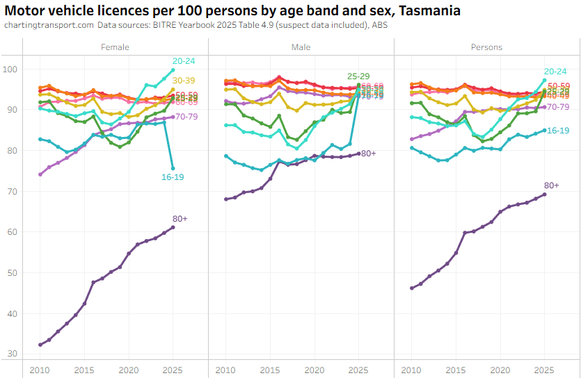 I’ll dive deeper in licence ownership by age band and gender for Tasmania because there are further issues: