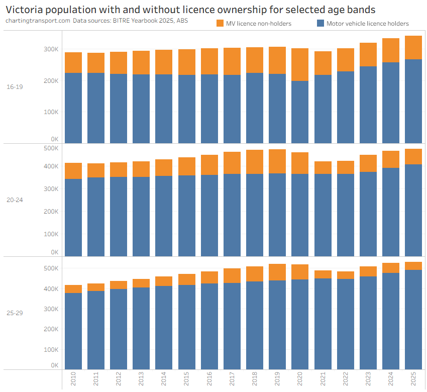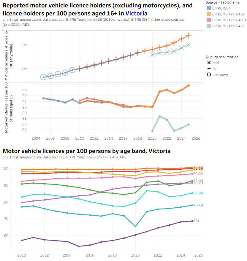 Table 4.11 consistently reports lower licence numbers than tables 4.9 and 4.10 so I’m considering that suspect. There was a large step up in licence ownership rates for many younger age bands in 2021 but that is plausible with the exodus of international students during COVID (as discussed above). Overall rates of ownership appear to be much higher for 2023-2025 with growth in all age bands, which doesn’t seem implausible. Perhaps Victorians were spooked by extended COVID lockdowns and decided a driver’s licence is more essential? The data in table 4.10 is slightly above the data from IS84 and table 4.9 for the years 2010 to 2013 but it’s not by a lot, so I’m not discarding that.