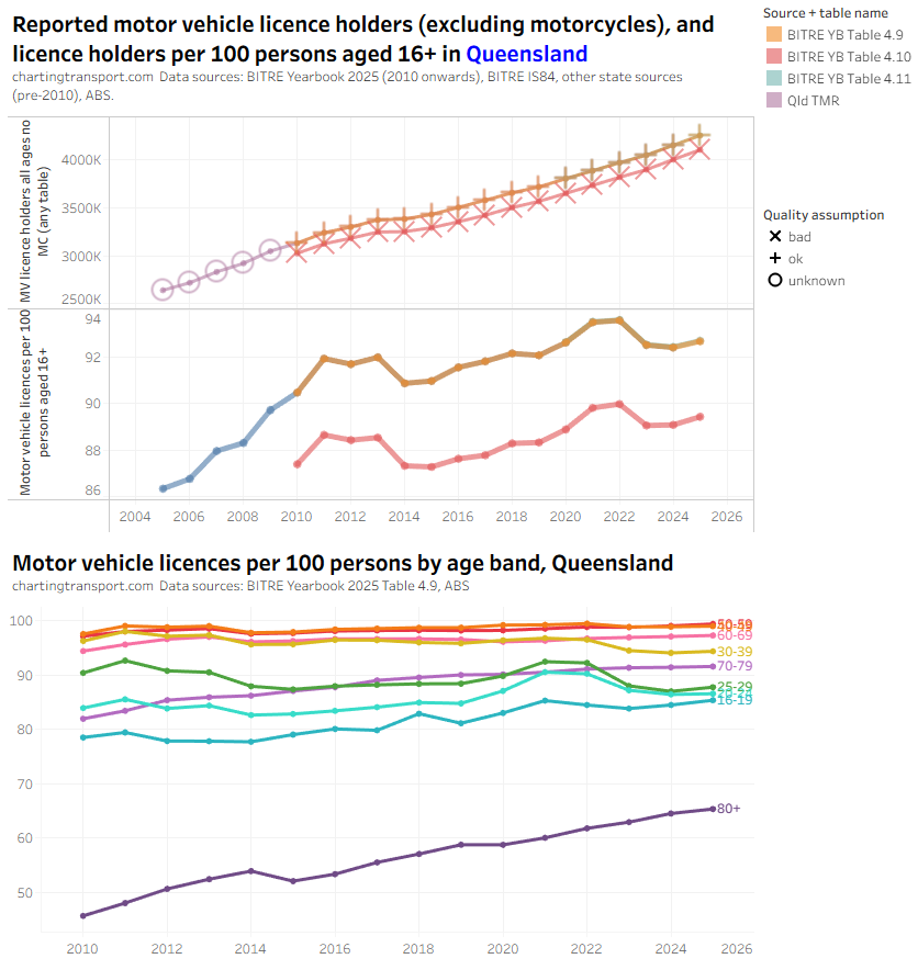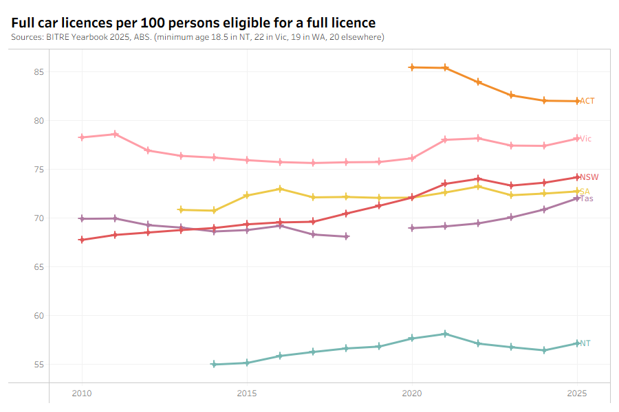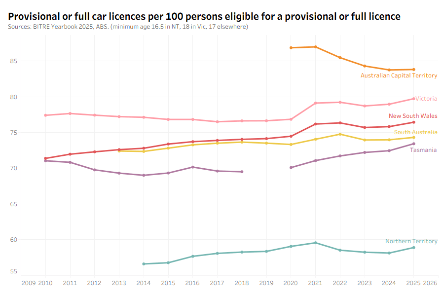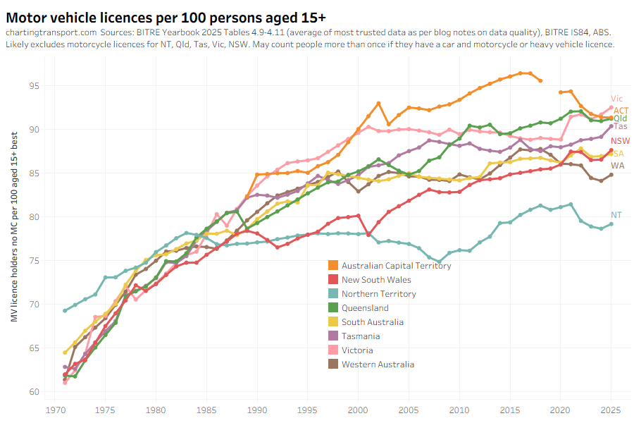 Data quality note: I strongly suspect there is double counting of persons for Victoria and maybe also Queensland and the ACT, but not other states. The Victorian metric is also people aged 22+, the highest threshold of all states because the graduated licencing scheme. I have subtracted motorcycle licences from car licences for Queensland as this produces much more plausible figures. So be careful comparing states.