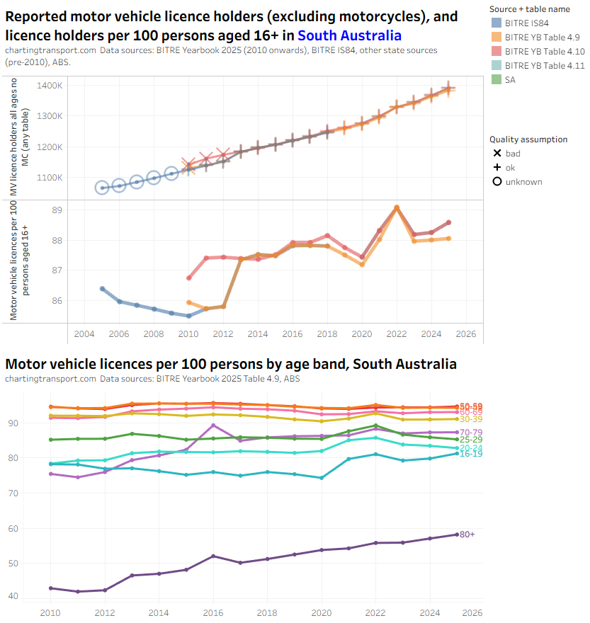 Collecting this sort of data is a undoubtedly a nightmare for BITRE, and it’s possibly also a nightmare for jurisdictions trying to report data to BITRE. There’s confusion about how to treat people with car and heavy vehicle licences, and people with car and/or motorcycle licences. Hopefully in future Yearbooks BITRE can work with state agencies to improve the consistency and quality.