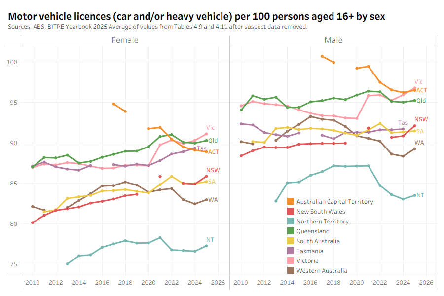 These rates are lower than in the first chart, as the first chart likely includes people with motorcycle and/or truck licences. Unfortunately I don’t trust the available data for Queensland and Western Australia.