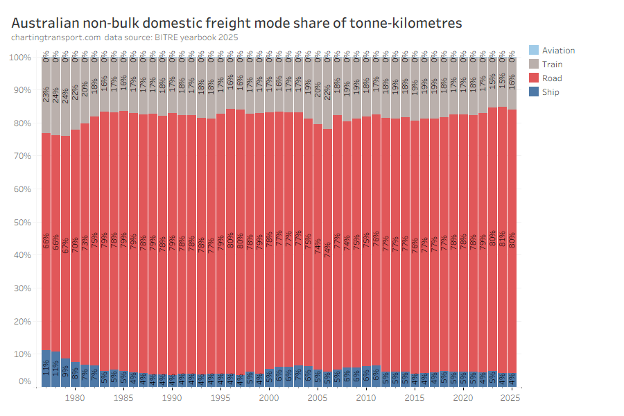 Data source: Australian Bureau of Infrastructure and Transport Research Economics (BITRE) Infrastructure and Transport Statistics Yearbook 2025 (published annually in December)