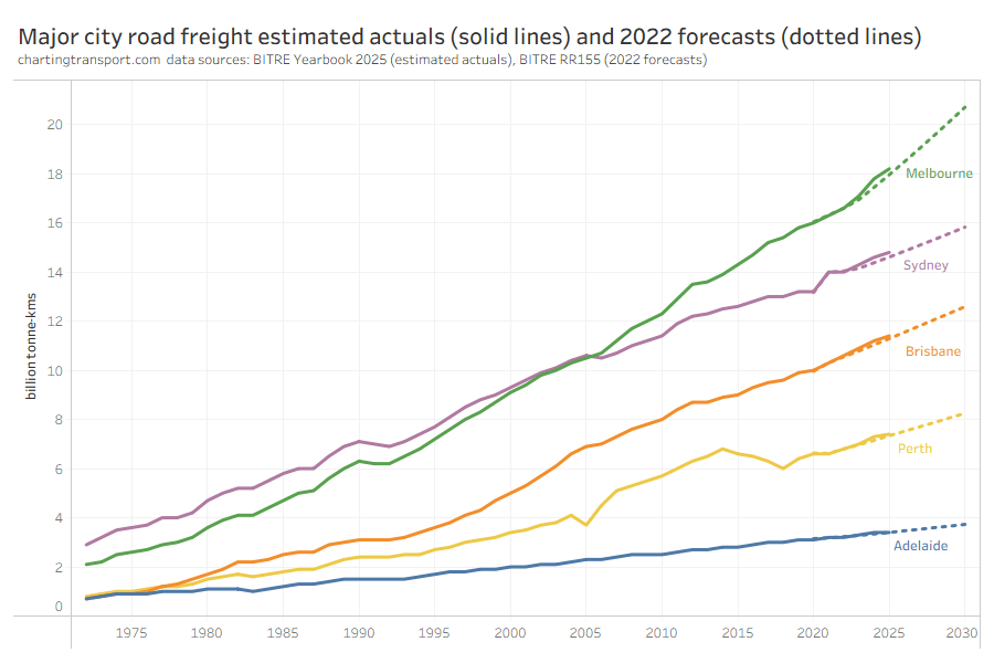 Road freight volumes in the major cities have been growing strongly, and have slightly exceeded BITRE’s 2022 forecasts in the four largest cities (but not Adelaide). Curiously Melbourne has significantly more tonne-kms of freight movements that Sydney, possibly owing to Melbourne’s much larger urban footprint despite having similar populations.