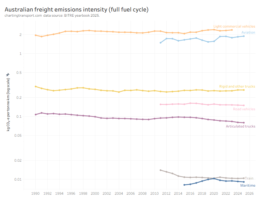 Technical note: I’ve excluded estimates for light commercial vehicles in 2023-24 and 2024-25 as the freight volumes had an implausible step reduction from 2022-23, while the emissions estimates did not. I’ve raised this suspect data with BITRE.