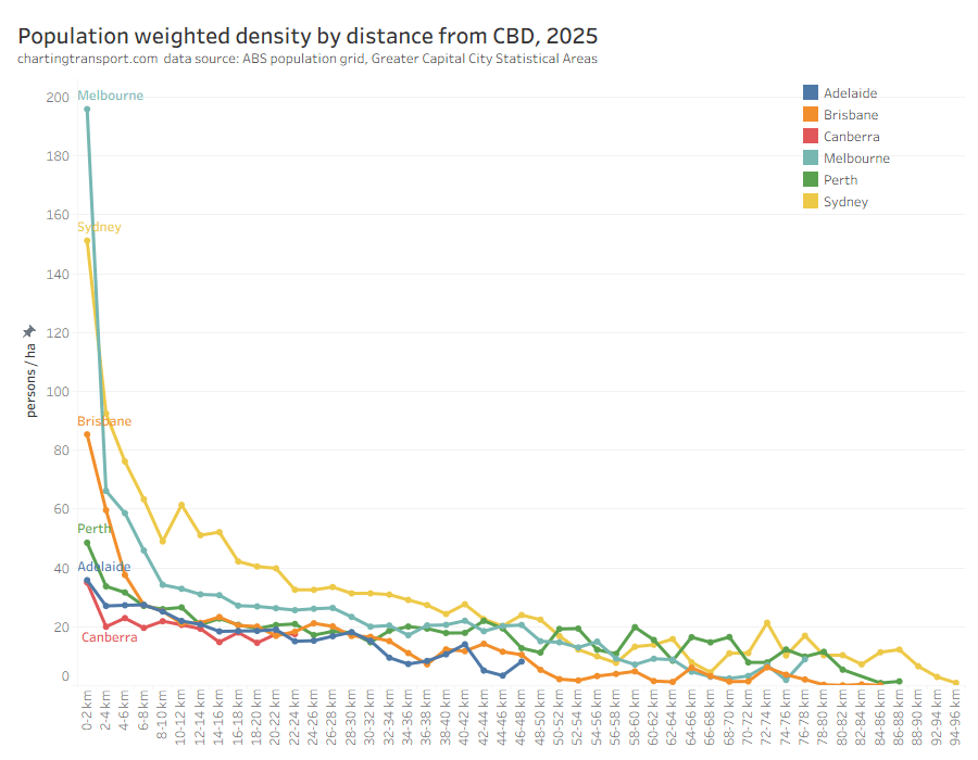 Sydney has significantly higher density than all other cities at most distances from CBDs – up to 42 km out, with Melbourne a fair step behind. Most other cities flattened out to around 20-26 persons/ha from around 6+km out from their CBDs.