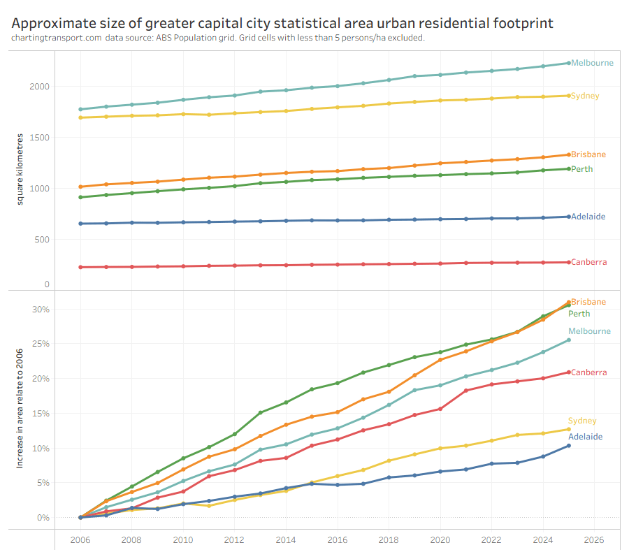The bottom half of the chart shows that Perth and Brisbane have had the largest percentage growth in urban residential footprint since 2006, followed by Melbourne. Sydney and Adelaide have had the least growth in footprint, and are also seeing the least population growth in percentage terms.