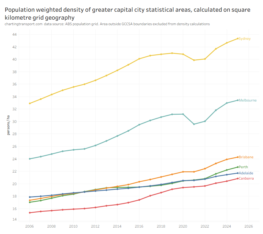 Population weighted density here is calculated using the ABS square kilometre population grid, clipped by greater capital city statistical area boundaries. Hobart and Darwin are excluded because of small footprints. For more discussion on density measurement and deeper analysis see this post.
