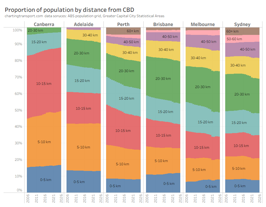 Most cities have seen a general trend towards more of their population living further from the CBD, although the distribution appears to have stabilised in Sydney in recent years.