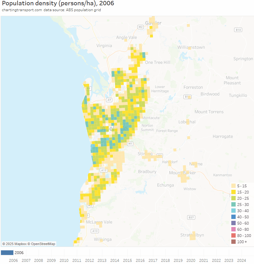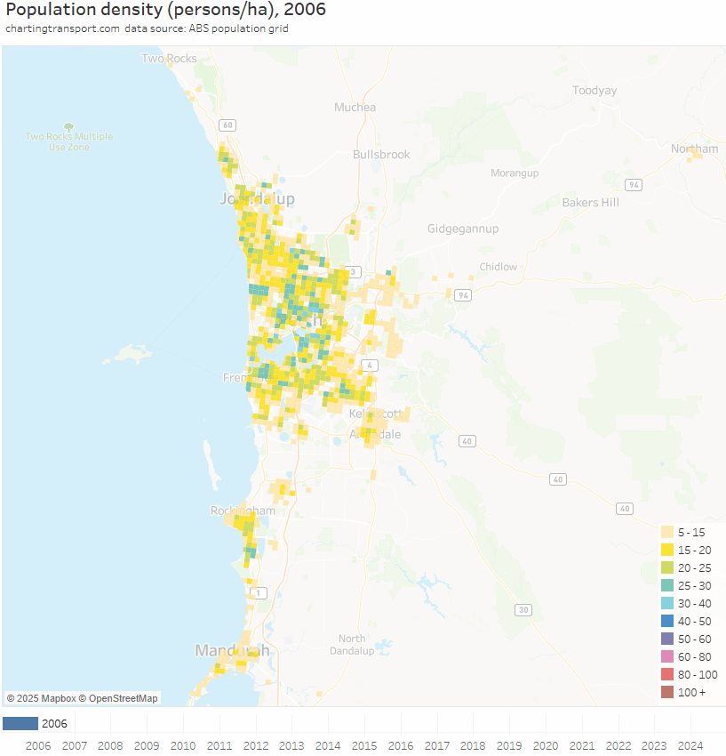 Perth had a dramatic shift in 2009 with the opening of the Mandurah rail line. Despite a few new stations and the opening of the Airport / High Wycombe line in late 2022, it has struggled to maintain it’s share of population close to train stations because of significant urban sprawl. MetroNet projects including the new Ellenbrook line and the extension of the northern suburbs line to Yanchep will probably make a big difference for the June 2025 assessment, but with with unrestrained urban sprawl it will likely be an ongoing challenge.