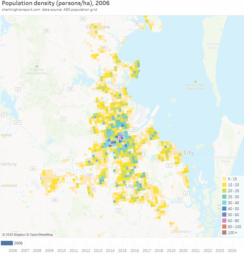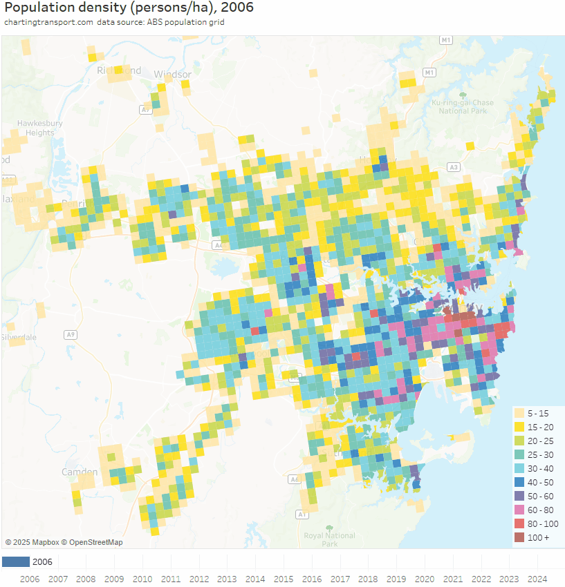 The following animated maps show the changing density of Australia’s six largest cities between 2006 and 2024:
